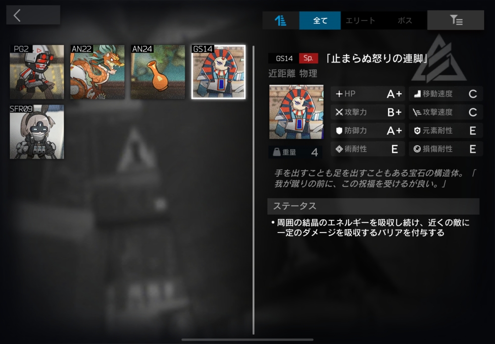 手を出すことも足を出すこともある宝石の構造体。【祝福の力場】(自動回復/初期SP10/必要SP15)2秒チャージした後、半径1.5以内の【ボス】以外の敵全員に物理・術ダメージを吸収するバリアを付与する。5体ほど襲いかかってくる。