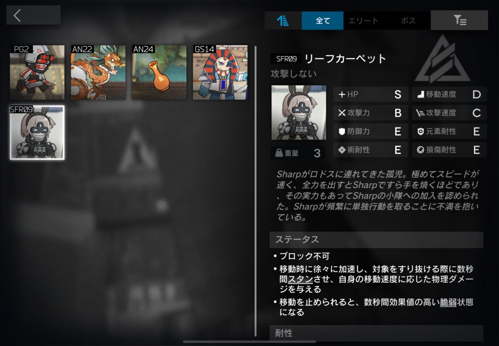 Sharpがロドスに連れてきた孤児。通常攻撃せず、ブロック不可。0.333秒ごとに移動速度が50%上昇する。この効果は30回まで累積する。加速し始めの5秒間は移動速度が上昇しない。自身の半径0.0001の範囲に入った味方に「現在の移動速度×600」の物理ダメージと4秒間のスタンを与えてくる。凍結/浮遊/恐怖/バインドを受けると移動速度がリセットされ、6秒間100%の脆弱状態になる。この脆弱が終わると、再度移動速度上昇を行い始める。