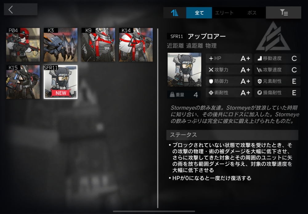 Stormeyeの飲み友達。ブロックされていない時に物理/術ダメージを受けると【反撃の矢雨】を使用可能。使用した場合、その攻撃で受けたダメージは-80%される。【反撃の矢雨】(自動回復/初期SP4/必要SP4)攻撃してきた味方と周囲8マスの味方全員に攻撃力120%の物理ダメージを与え(迷彩を無視)、10秒間攻撃速度-50。効果中に再付与されても攻撃速度低下は累積せず、持続時間だけリセットされる。スキル中はスタン無効。倒されると、一度だけ5.667秒かけてHPを100%回復する。