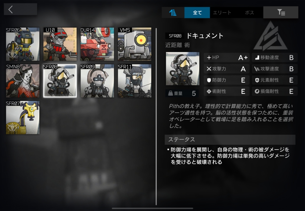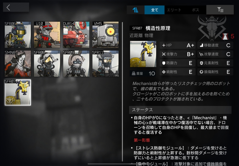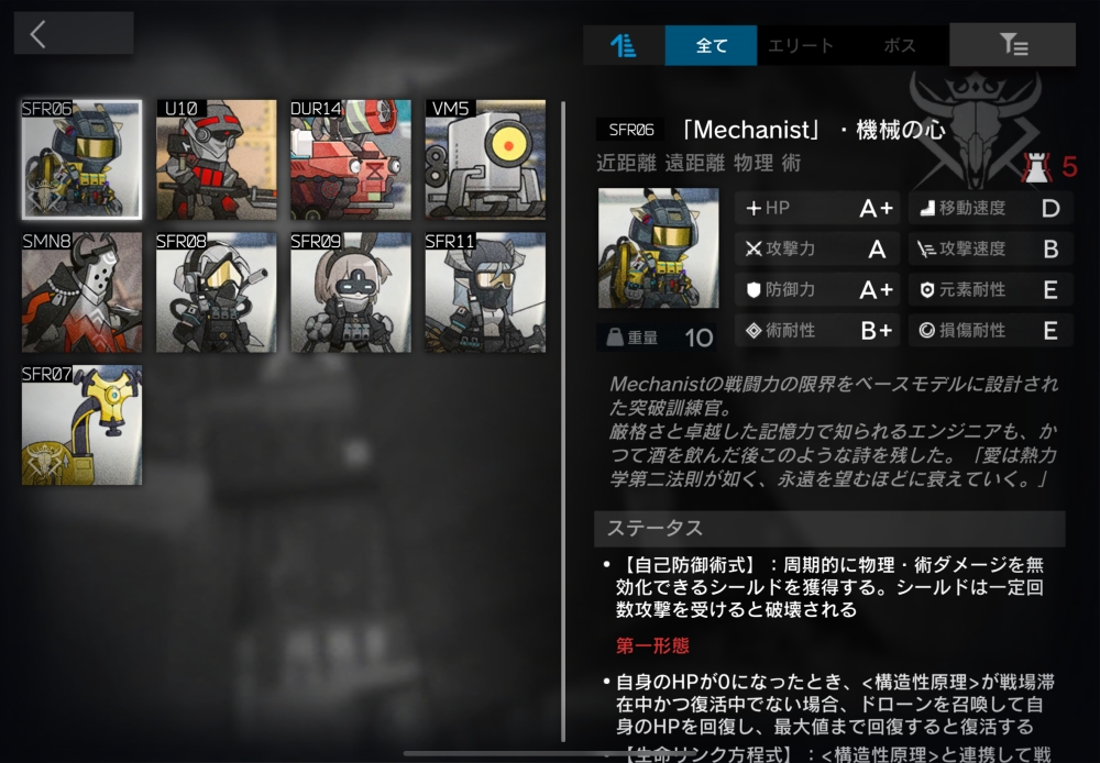Mechanistの戦闘力の限界をベースモデルに設計された突破訓練官。遠距離物理攻撃をしてくる。【自己防御術式】(自動回復/必要SP1)物理/術ダメージを無効化するシールドを50枚獲得。シールド残量はMechanist右下の三角形マークで示される。