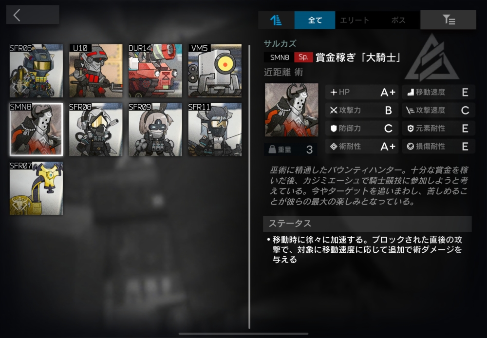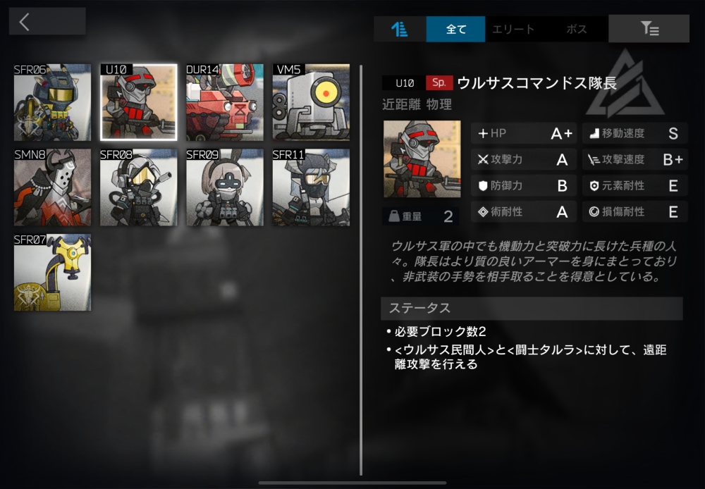 ウルサス軍の中でも機動性と突破能力を兼ね備えた兵種。1体でブロック数を2消費する性質を持つ。2体ほど襲いかかってくる。