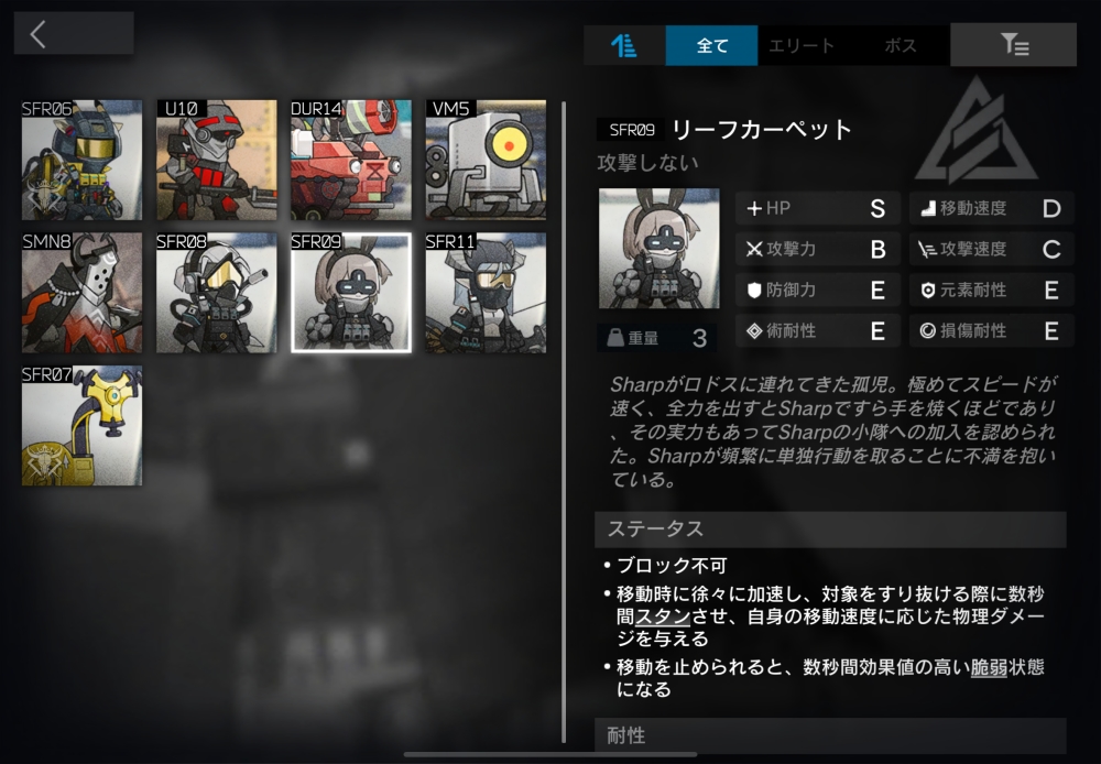 Sharpがロドスに連れてきた孤児。通常攻撃せず、ブロック不可。0.333秒ごとに移動速度が50%上昇する。この効果は30回まで累積する。加速し始めの5秒間は移動速度が上昇しない。自身の半径0.0001の範囲に入った味方に「現在の移動速度×600」の物理ダメージと4秒間のスタンを与えてくる。凍結/浮遊/恐怖/バインドを受けると移動速度がリセットされ、6秒間100%の脆弱状態になる。この脆弱が終わると、再度移動速度上昇を行い始める。