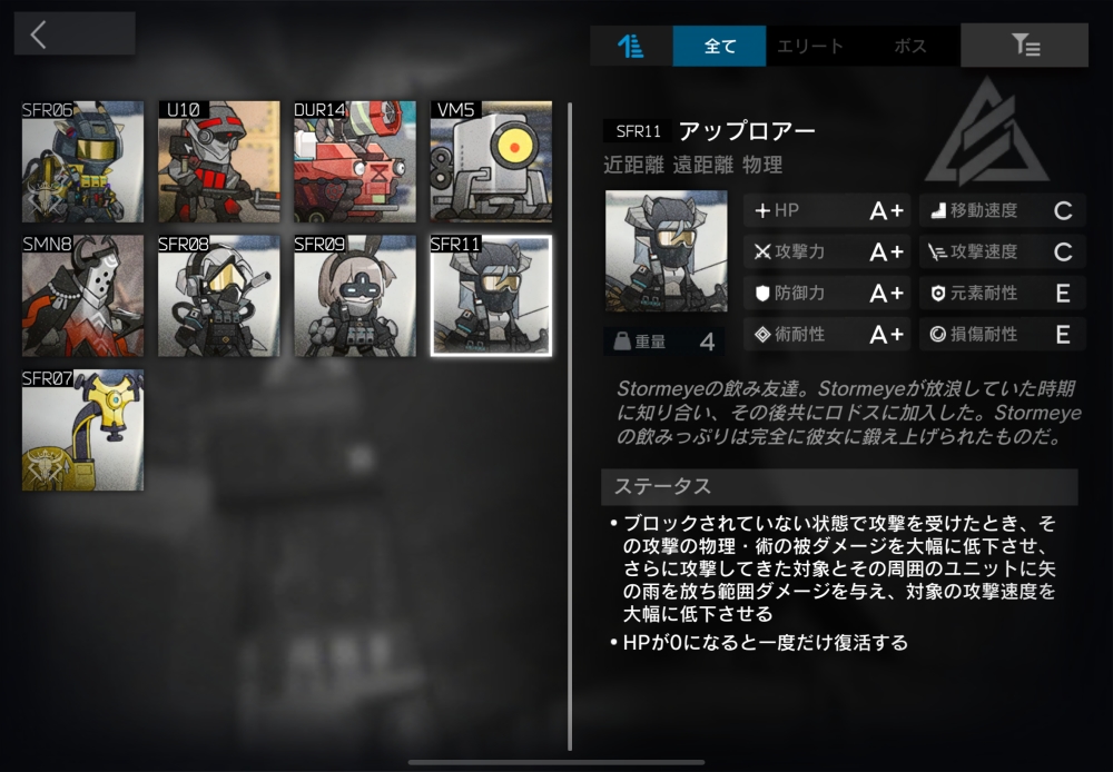 Stormeyeの飲み友達。ブロックされていない時に物理/術ダメージを受けると【反撃の矢雨】を使用可能。使用した場合、その攻撃で受けたダメージは-80%される。【反撃の矢雨】(自動回復/初期SP4/必要SP4)攻撃してきた味方と周囲8マスの味方全員に攻撃力120%の物理ダメージを与え(迷彩を無視)、10秒間攻撃速度-50。効果中に再付与されても攻撃速度低下は累積せず、持続時間だけリセットされる。スキル中はスタン無効。倒されると、一度だけ5.667秒かけてHPを100%回復する。