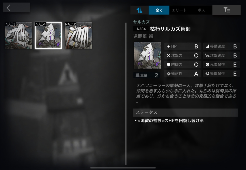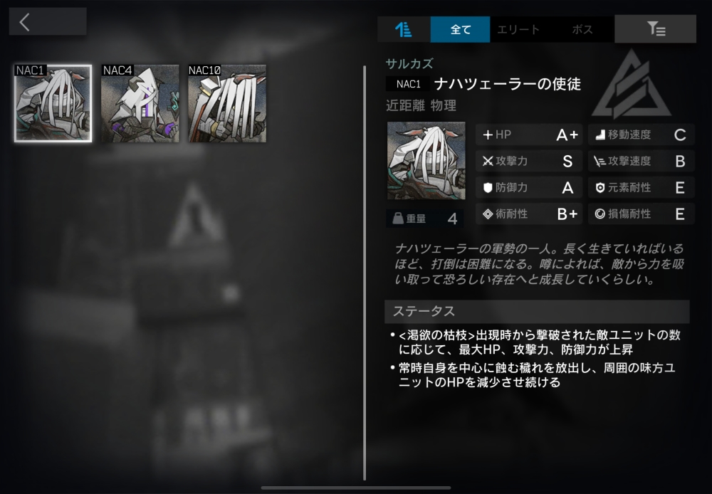 ナハツェーラー軍勢の一員。攻撃範囲内の渇欲の枯枝のHPを回復し続ける。1体だけアーツを撃ち込んでくる。