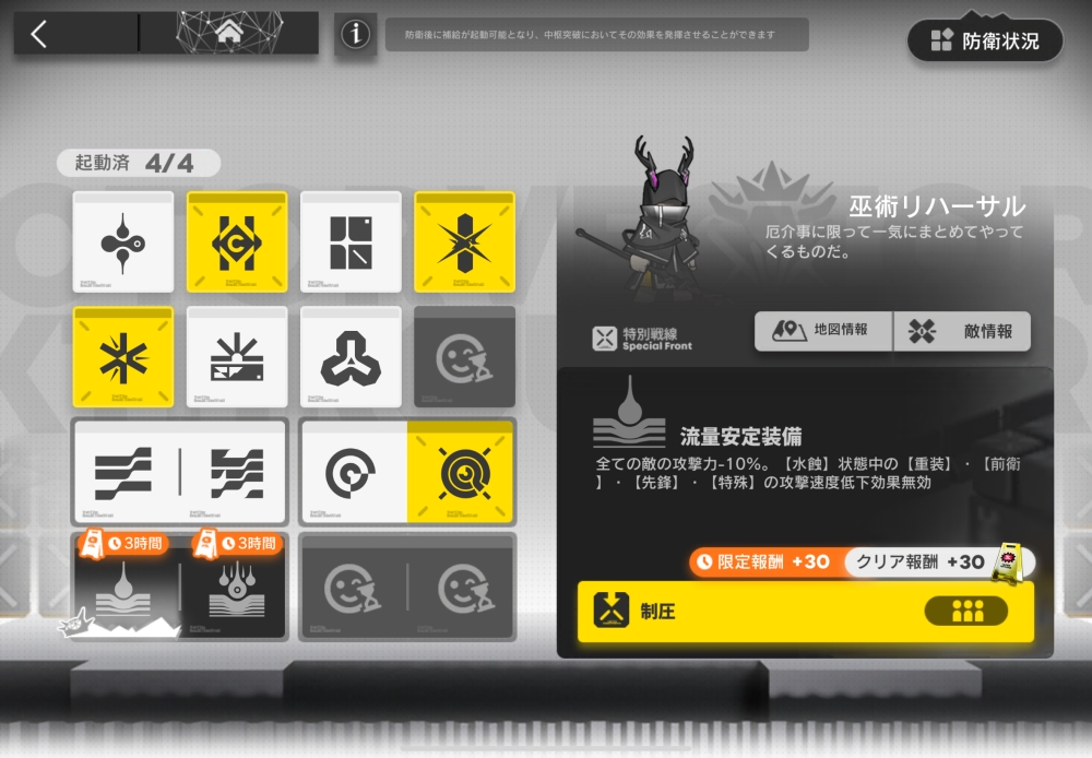 クリアすると「全ての敵の攻撃力-10%。【水蝕】状態中の【重装】・【前衛】・【先鋒】・【特殊】の攻撃速度低下効果無効」を装備できるようになるステージ。