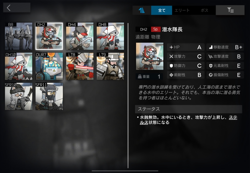 プロ向けの潜水トレーニングを受けており、人工海の海底まで潜水することができる水中のエリート。遠距離物理攻撃をしてくる。水蝕無効。水中にいる時、攻撃力+40%。ステルス能力を得る。5体ほど襲いかかってくる。
