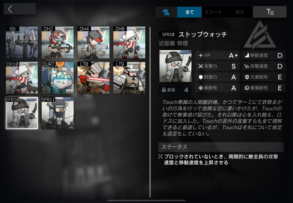 Touch専属の人間翻訳機。【奮起】(自動回復/必要SP3[初回のみ5])ブロックされていない時に使用可能。4秒間、マップ上の敵全員の攻撃速度+80・移動速度+100%。効果中に再付与されても効果は累積しないが、持続時間はリセットされる。なお、この効果は無効化できる。