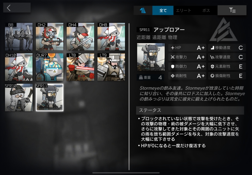 Stormeyeの飲み友達。ブロックされていない時に物理/術ダメージを受けると【反撃の矢雨】を使用可能。使用した場合、その攻撃で受けたダメージは-80%される。【反撃の矢雨】(自動回復/初期SP4/必要SP4)攻撃してきた味方と周囲8マスの味方全員に攻撃力120%の物理ダメージを与え(迷彩を無視)、10秒間攻撃速度-50。効果中に再付与されても攻撃速度低下は累積せず、持続時間だけリセットされる。スキル中はスタン無効。倒されると、一度だけ5.667秒かけてHPを100%回復する。