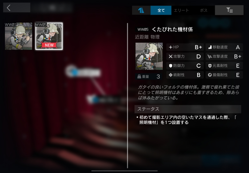 ガタイの良いフォルテの機材係。撮影エリア内の空きマスに初めて侵入した時、そのマスに装置<照明機材>を配置する。今回初登場。