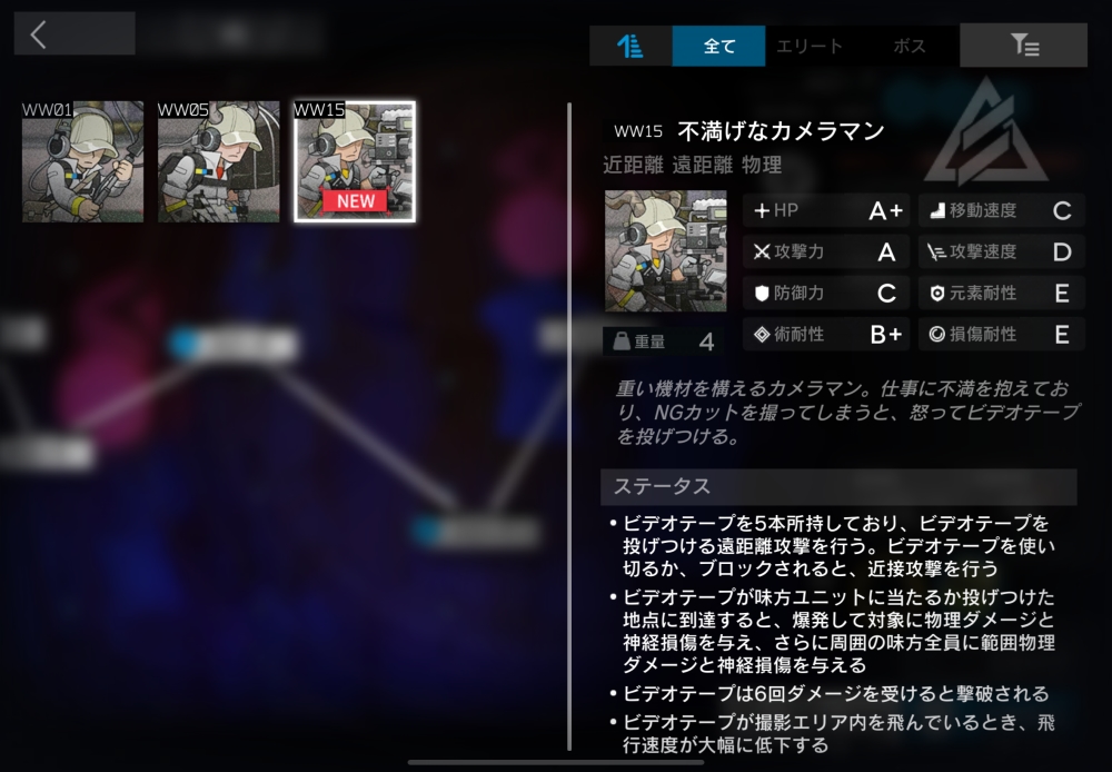 重い機材を構えるカメラマン。遠距離物理攻撃をしてくる。【恨みを晴らす】(自動回復/初期SP4/必要SP9)ブロックされていない時に、5回まで使用可能。ヘイト値の最も高い味方のいるマスに<ビデオテープ>を投げつける。今回初登場。
