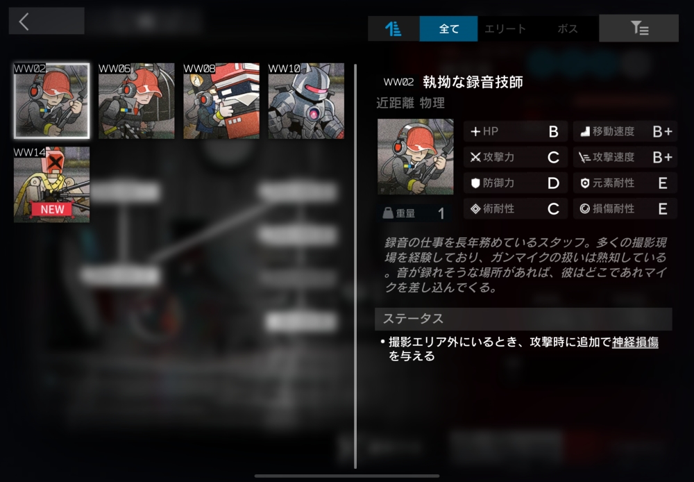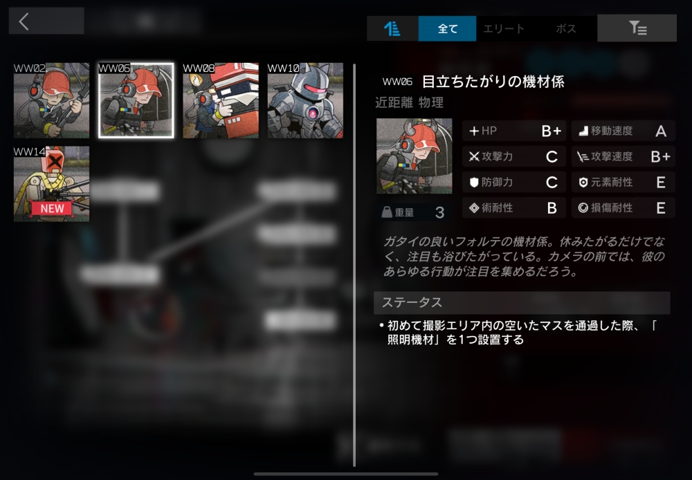 ガタイの良いフォルテの機材係。撮影エリア内の空きマスに初めて侵入した時、そのマスに装置<照明機材>を配置する。10体ほど襲いかかってくる。