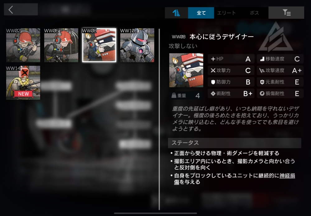 重度の先延ばし癖があり、いつも納期を守れないデザイナー。正面から受ける物理/術ダメージ-80%。撮影エリア内で、エリアを生成している撮影カメラと向かい合っている間は反対方向(カメラと同じ向き)を向き続ける。自身をブロックしている味方に、毎秒攻撃力20%(80)の神経損傷を与えてくる。3体ほど襲いかかってくる。