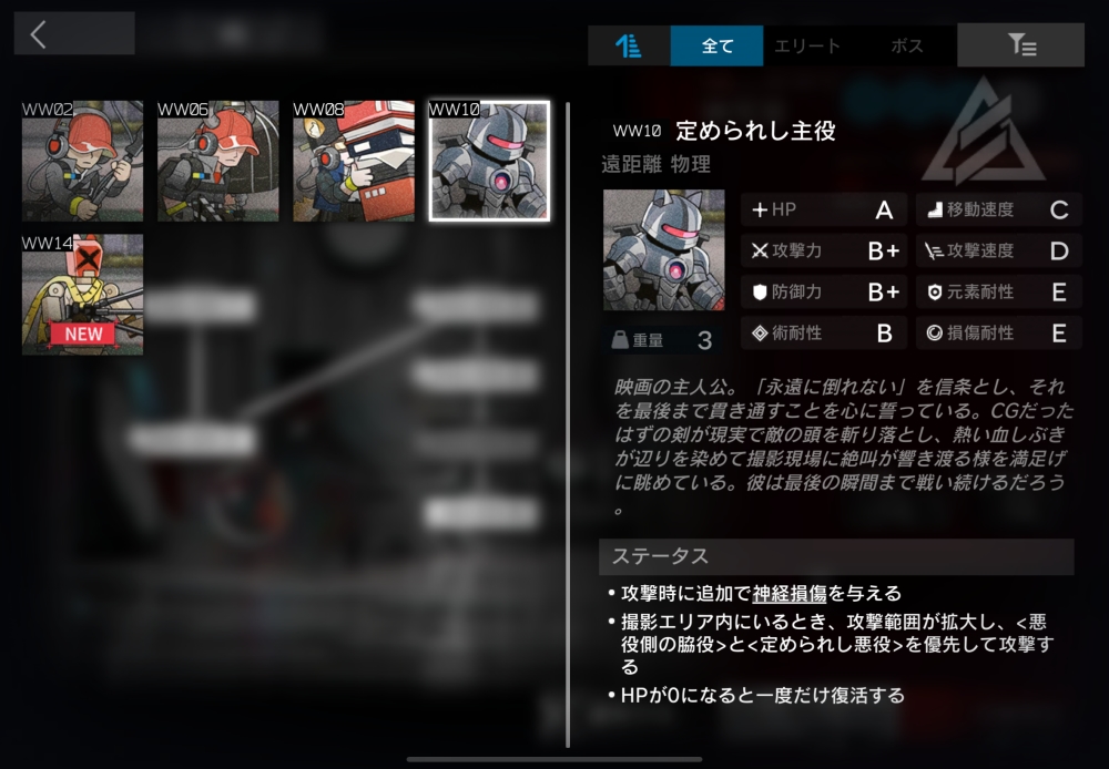 映画の主人公。通常攻撃時、追加で攻撃力15%(120)の神経損傷を与えてくる。HPが0になると、一度だけ3秒かけてHPを100%回復する。初めて撮影エリアに入ると、2秒間台本を読んだ後、役に入り込む。撮影エリア内にいると攻撃半径+2.0。また、定められし悪役系の敵を優先して攻撃し、これらに対しては攻撃力500%の物理ダメージを与える。2体ほど襲いかかってくる。