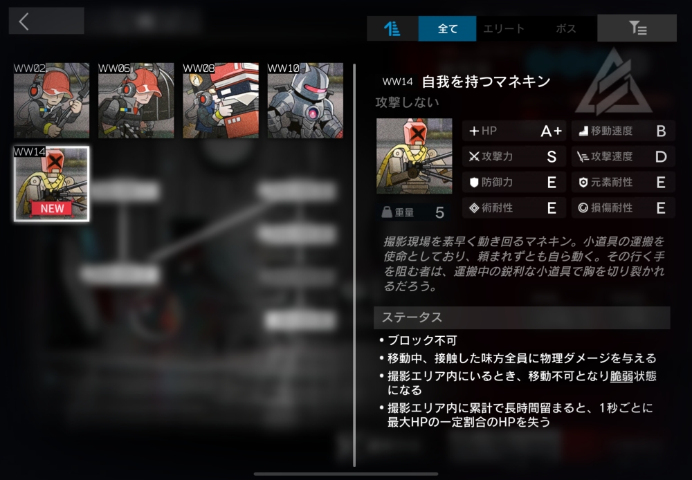 撮影現場を素早く動き回るマネキン。接触した味方に、攻撃力100%(2250)の物理ダメージを与えてくる。撮影エリア内では停止し、60%の脆弱状態になる。撮影エリアに累計150秒以上留まると、毎秒最大HP2%の確定ダメージを受ける。今回初登場。