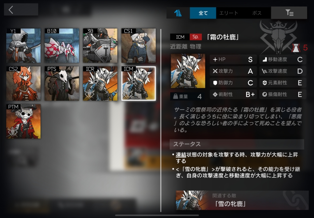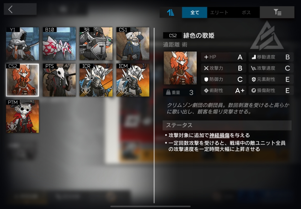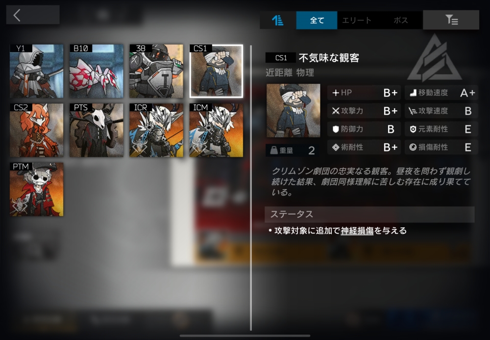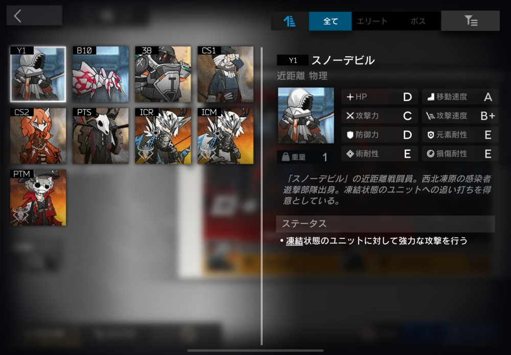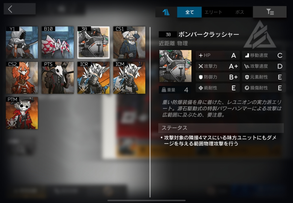 レユニオンに参加する実力派エリート。攻撃対象の隣接4マスのユニットには攻撃力50%(850)の物理ダメージを与えてくる。2体ほど襲いかかってくる。