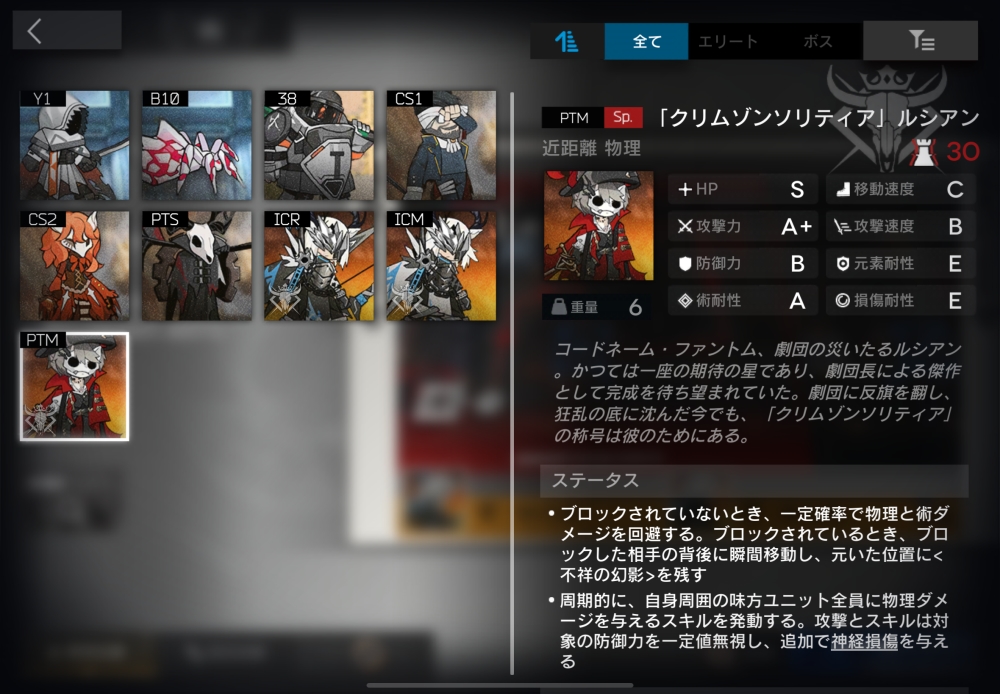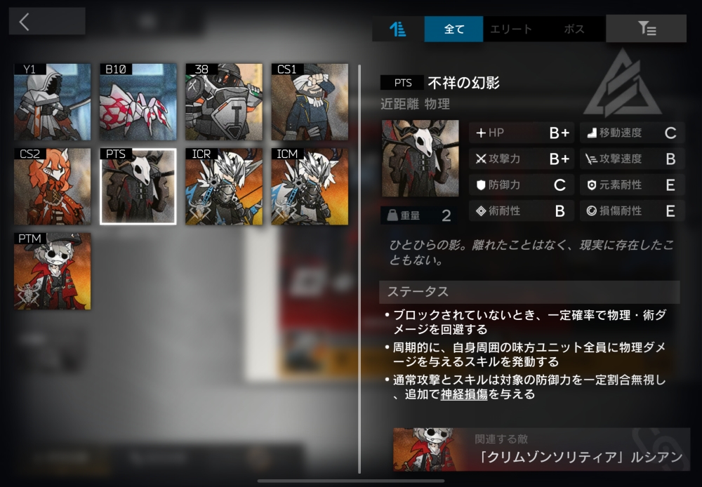 劇団の災ルシアン、コードネーム・ファントム。未ブロック時、物理・術回避率+40%。ダメージを与える時、対象の防御力を40%無視する。通常攻撃時、物理ダメージに加えて攻撃力20%(300)の神経損傷を与えてくる。【閃影】(自動回復スキル/初期10秒、以降15秒ごとに使用可能)ブロック相手をすり抜け、0.5秒かけて1.5マス分移動する。このスキルによる移動中は無敵。移動先が通行不可の場合、移動は発動しない。移動に成功した後、その場に不祥の幻影を召喚する。【AOE】(自動回復スキル/初期5秒、以降10秒ごとに使用可能)半径2.0以内の味方全員に、攻撃力の80%の物理ダメージと20%の神経損傷を与える。このスキルは迷彩を無視する。