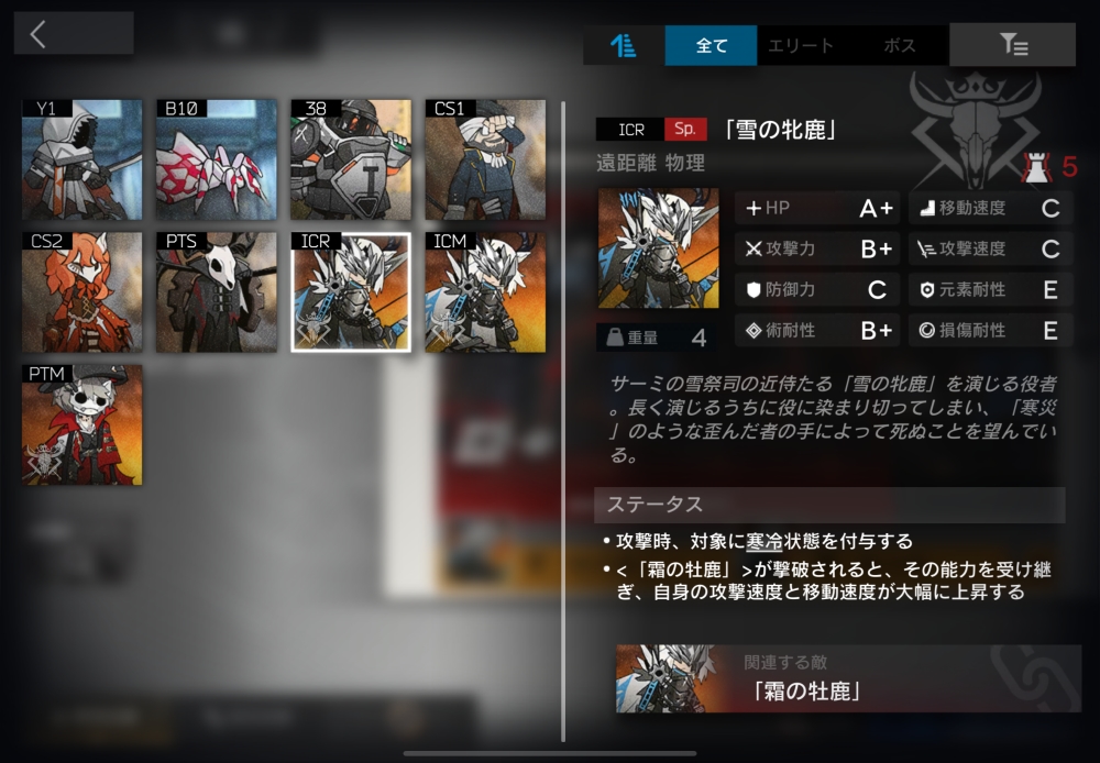 サーミの雪司祭の近侍「雪の牝鹿」を演じる役者。遠距離物理攻撃をしてくる。通常攻撃時、対象に5秒間寒冷を付与。自身がマップ上にいる時に「霜の牡鹿」が死亡するか防衛ラインに入ると、攻撃速度+100・移動速度2倍。さらに、凍結した味方へのダメージ倍率が250%に上昇。