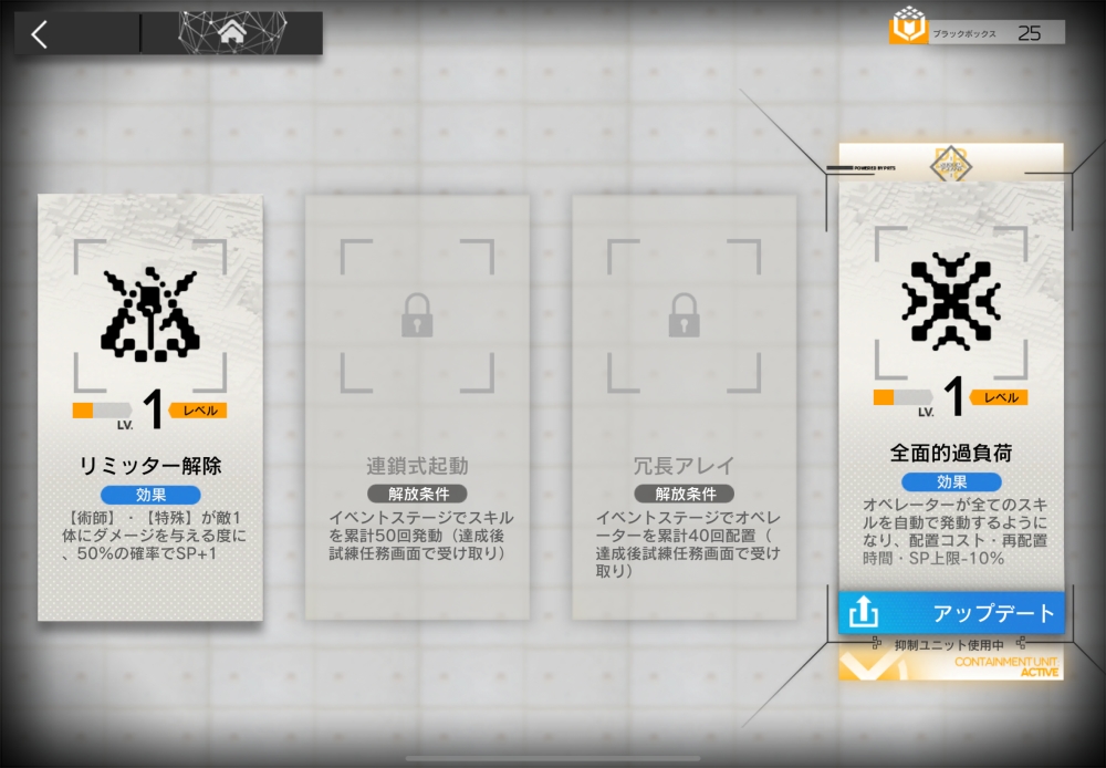 で攻略しています。抑制ユニットは、全面的過負荷を選択しています。まだ解放されていない場合は、標準試練を累計4回クリアして、試練任務で取得しましょう。