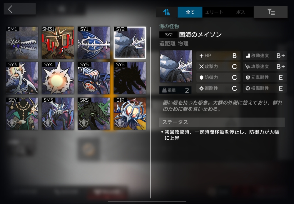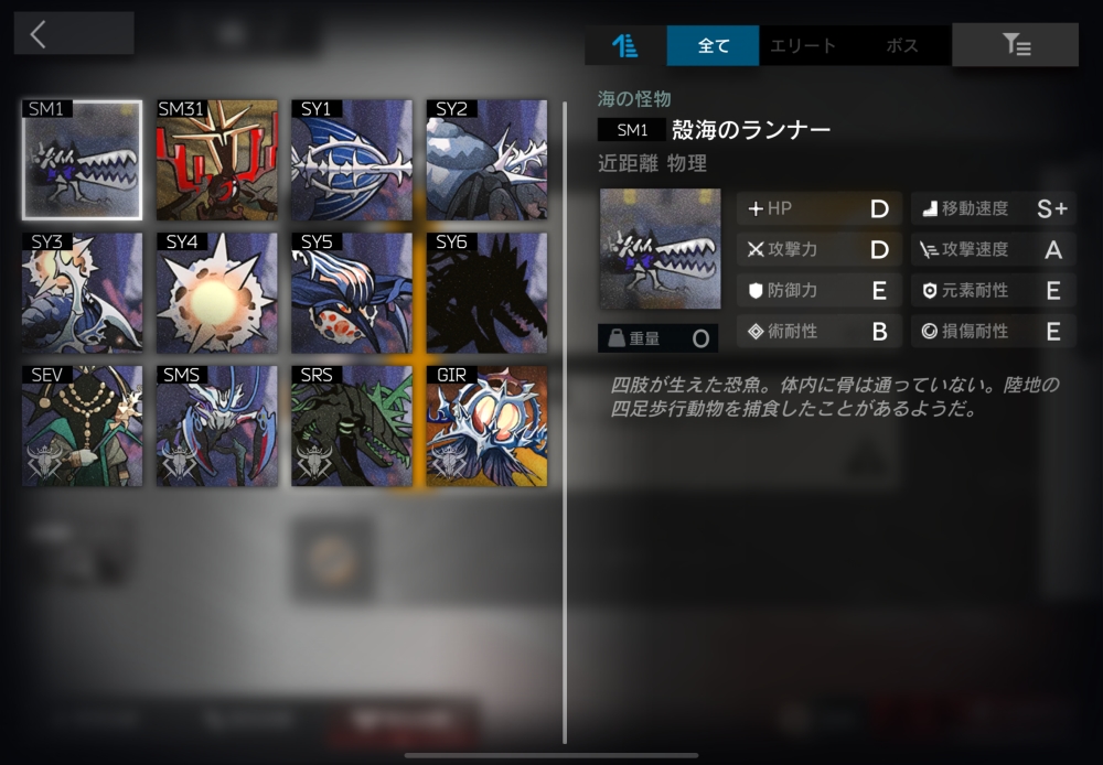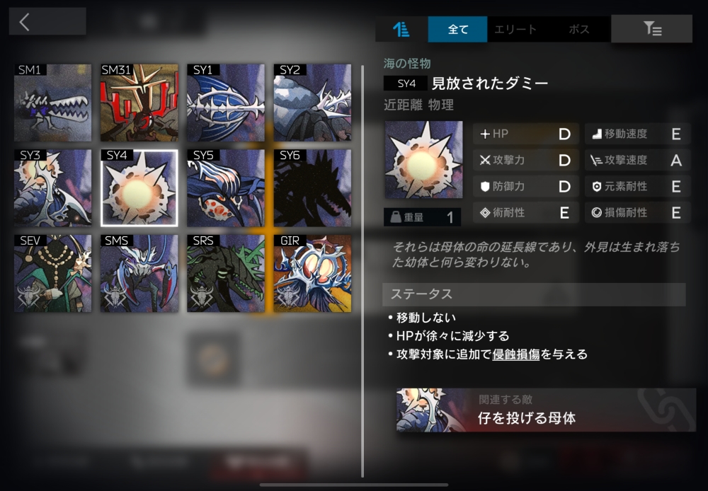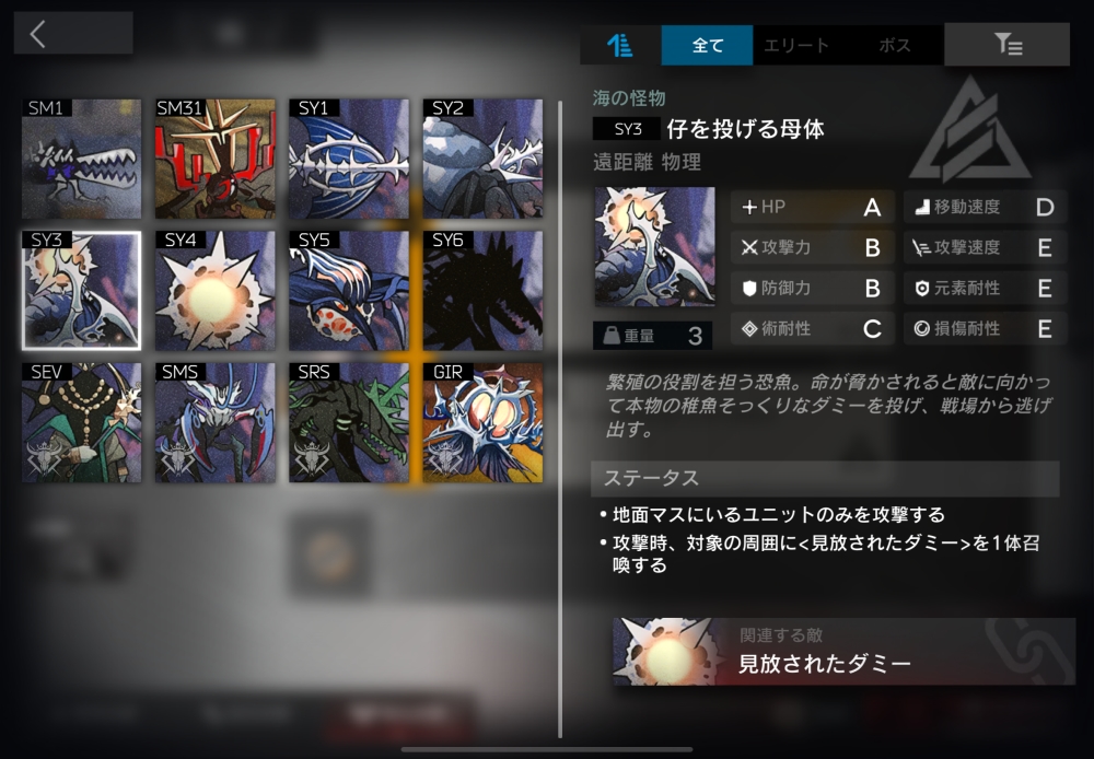 繁殖の役割を担う恐魚。遠距離物理攻撃をしてくる。地上の味方だけを攻撃する。通常攻撃時、対象の位置に見放されたダミーを召喚する。6体ほど襲いかかってくる。
