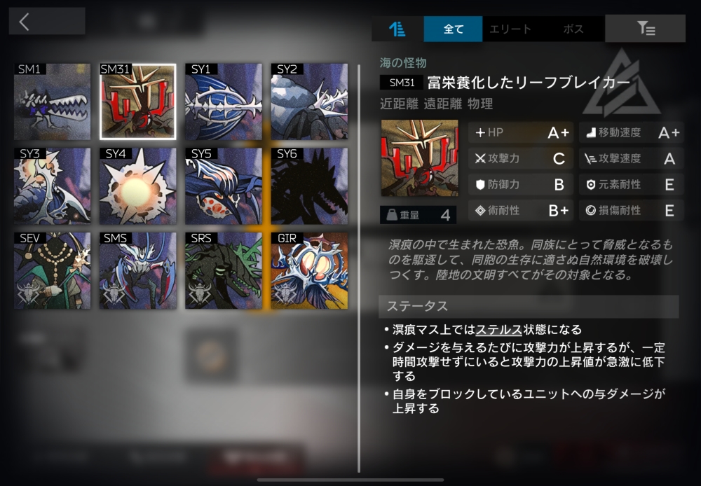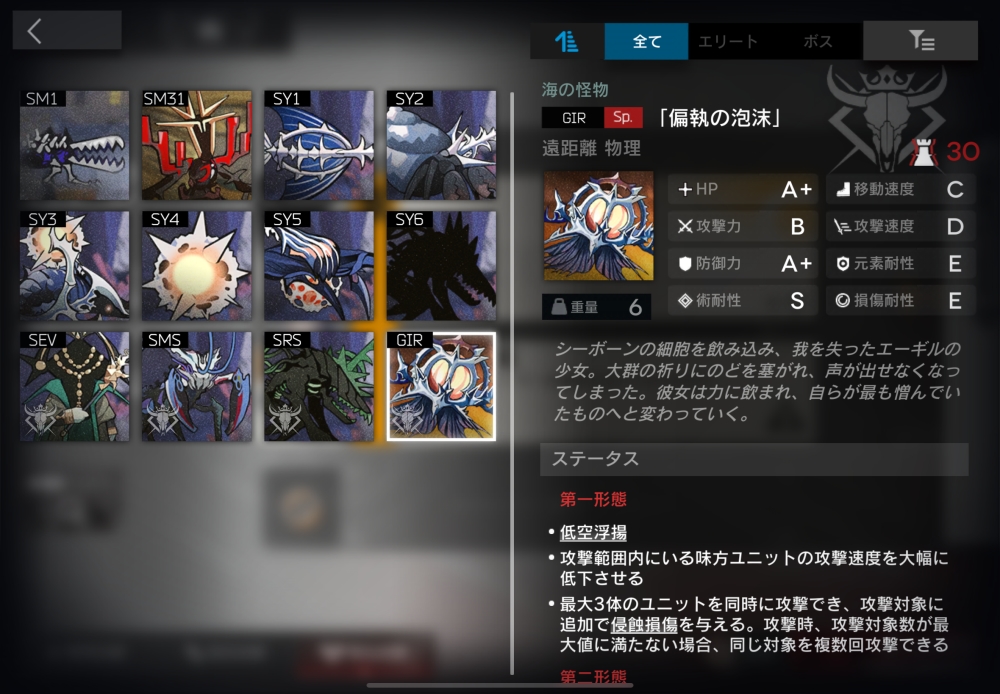 シーボーンの細胞を飲み込み、我を失ったエーギルの少女。低空浮揚能力を持つ。スタン・睡眠・凍結を受けると解除され、0.5秒スタンする。攻撃範囲内の味方全員の攻撃速度-60。通常攻撃時、攻撃力60%の侵蝕損傷を与えてくる。同時に3体まで攻撃可能。攻撃対象が3体未満なら、余った攻撃分で同じ対象を複数回攻撃する。