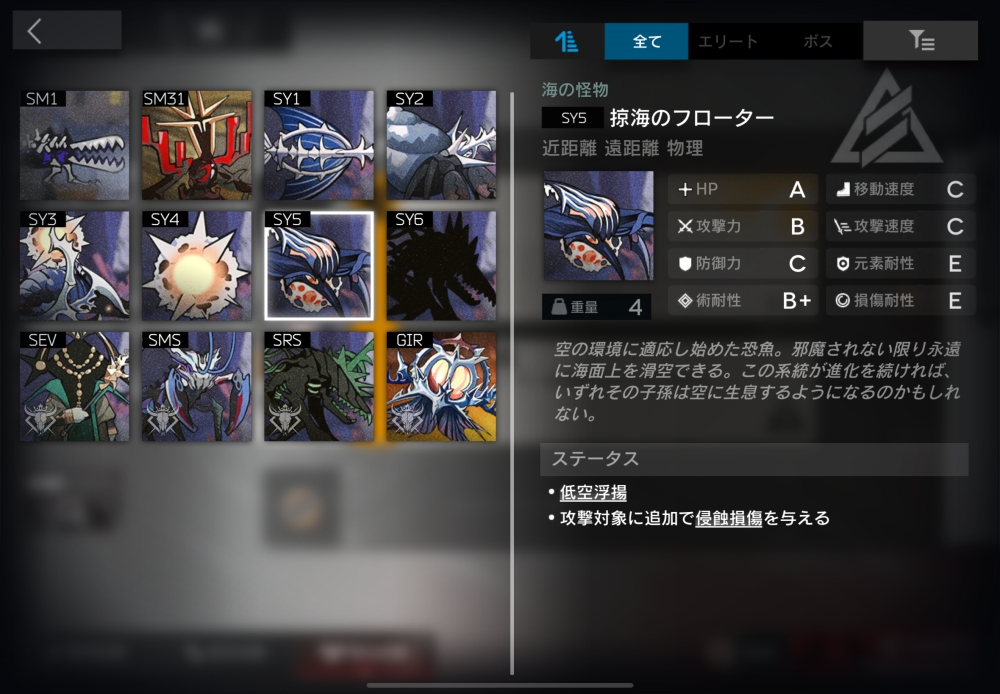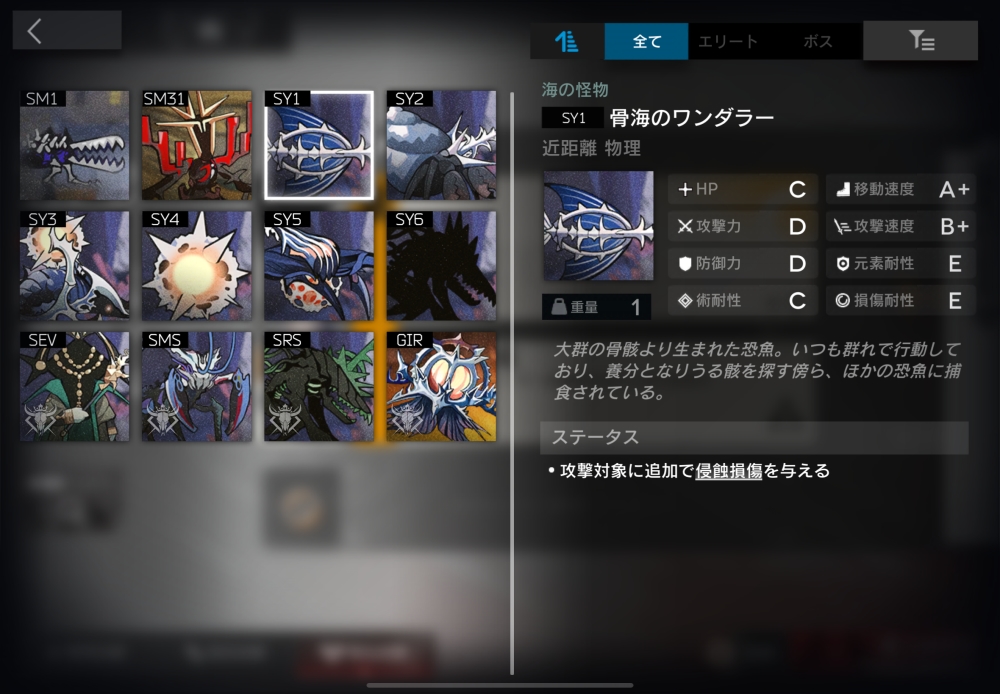 空の環境に適応し始めた恐魚。遠距離物理攻撃をしてくる。通常攻撃時、攻撃力50%(250)の侵蝕損傷を与えてくる。低空浮揚能力を持つ。スタン・睡眠・凍結状態になると解除され、近距離攻撃しかできなくなる。6体ほど襲いかかってくる。
