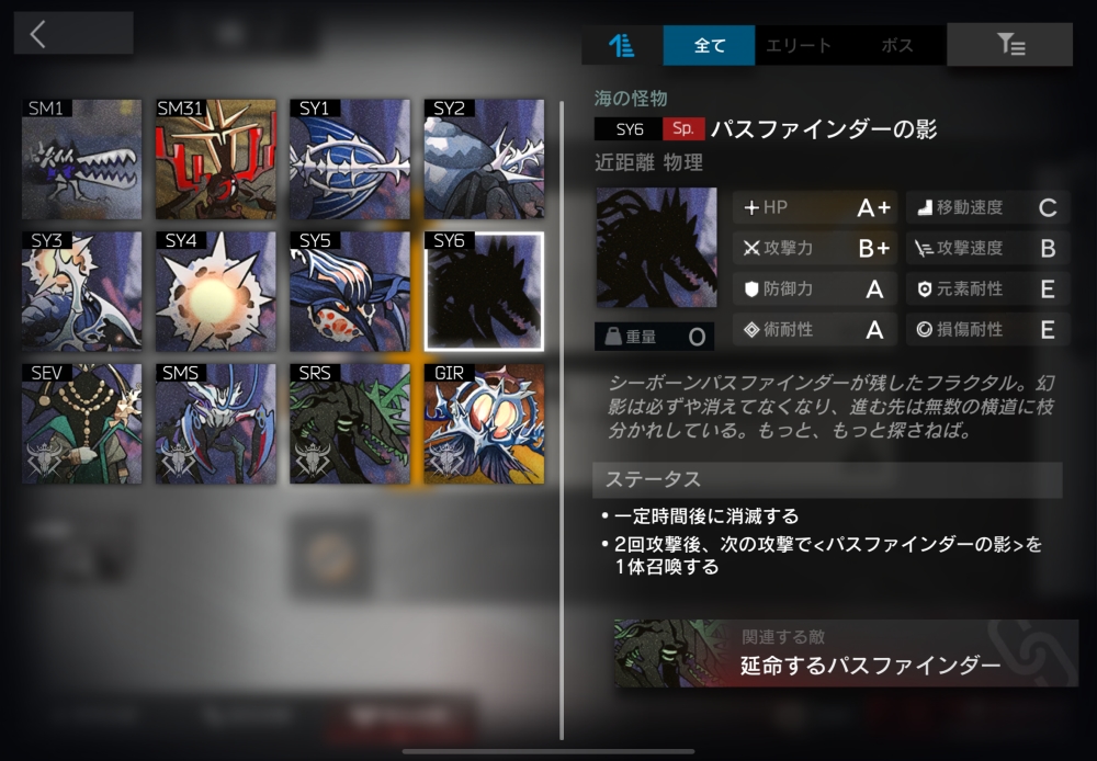 シーボーンパスファインダーが残したフラクタル。出現から90秒後に消滅する。【フラクタル生成】(攻撃回復/初期SP0/必要SP2)対象に攻撃力100%(600)の物理ダメージを与えてくる。マップ上のパスファインダーの影が12体以下なら、1体召喚する。