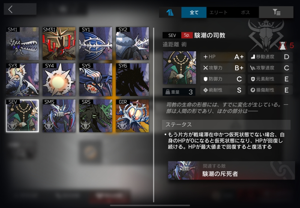 この司教の生命形態にはすでに変化が生じている。倒されるとHPを2%回復し、仮死状態に入る。【仮死状態】無敵。移動・攻撃せず、ブロック不可。毎秒HPを5%回復し、HPが100%まで回復すると通常状態に戻る。対になる験潮の蔑死者・験潮の斥死者が仮死状態になるか、防衛ライン(青マス)に入ると死亡する。