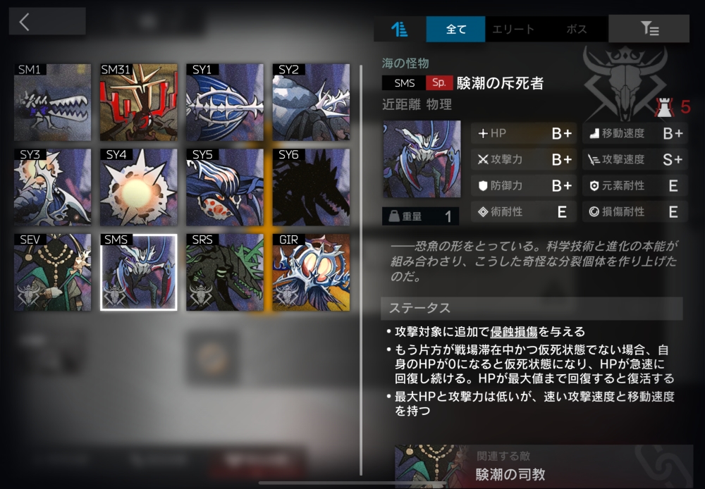 ──恐魚の形をしている。通常攻撃時、攻撃力50%の侵蝕損傷を与えてくる。倒されるとHPを2%回復し、仮死状態に入る。【仮死状態】無敵。移動・攻撃せず、ブロック不可。毎秒HPを10%回復し、HPが100%まで回復すると通常状態に戻る。対になる験潮の司教が仮死状態になるか、防衛ライン(青マス)に入ると死亡する。