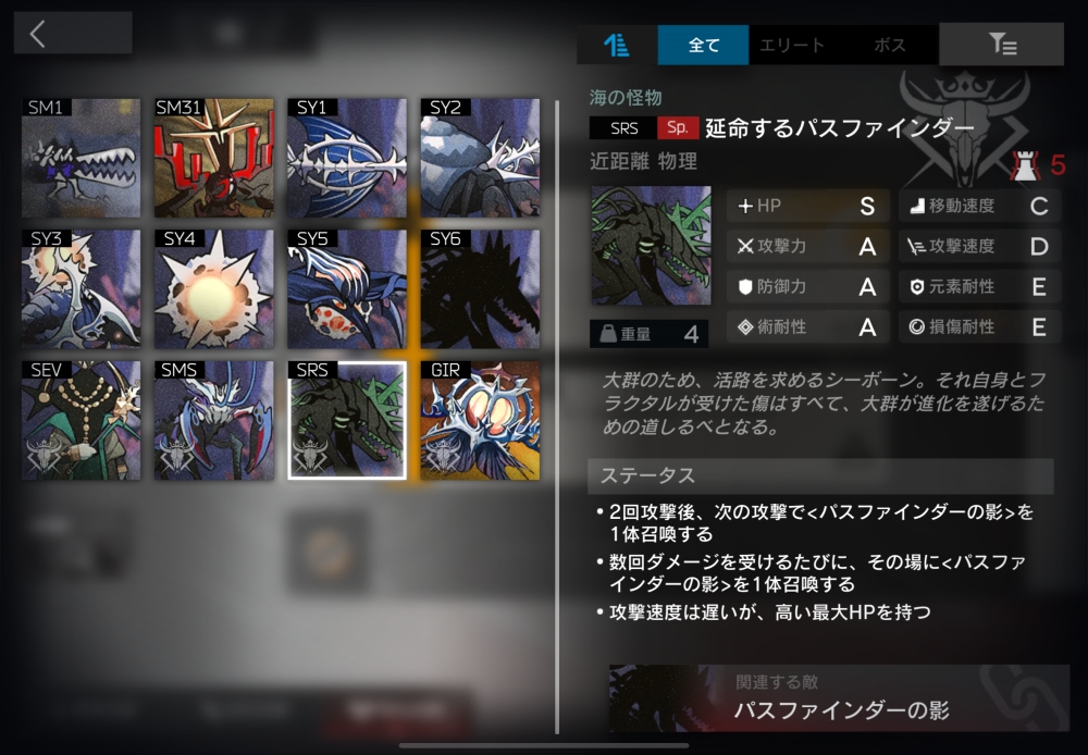 大群のために活路を探し求めるシーボーン。マップ上のパスファインダーの影が8体以下の時、5回ダメージを受けるたび1体召喚する。倒されると、全てのパスファインダーの影を消滅させる。【フラクタル生成】(攻撃回復/初期SP0/必要SP2)対象に攻撃力100%の物理ダメージを与えてくる。マップ上のパスファインダーの影が8体以下なら、1体召喚する。