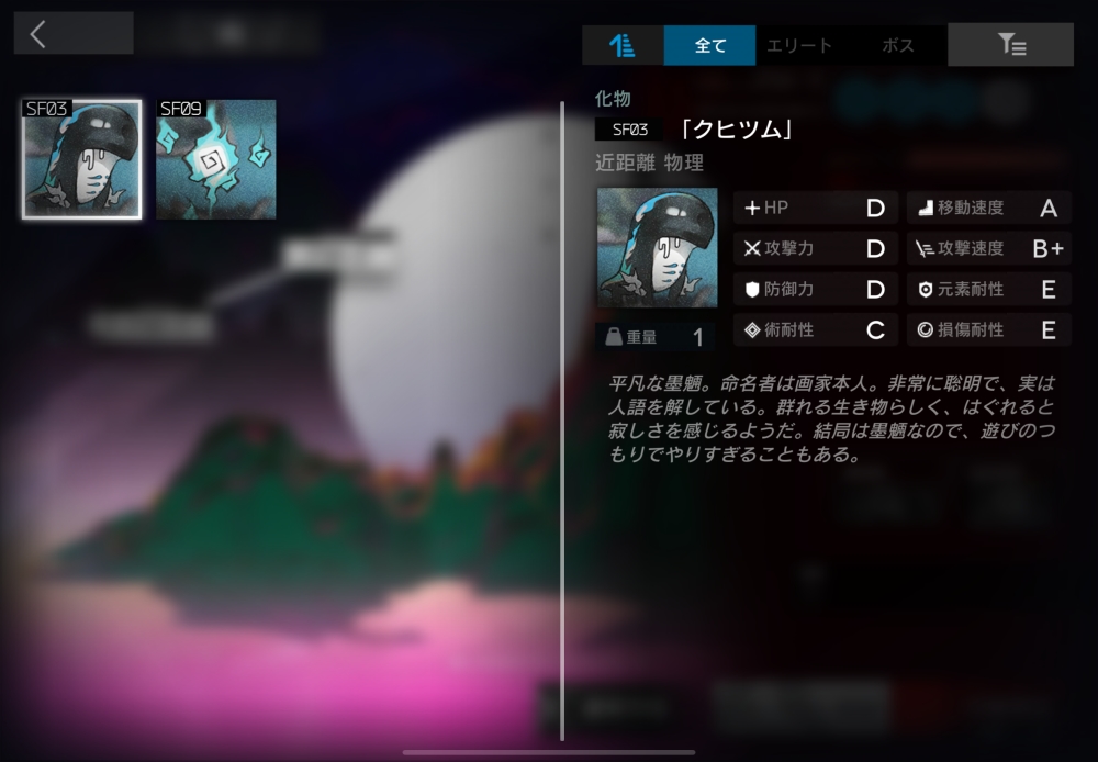 奇怪な墨魎、命名者は画家本人。近距離術攻撃をしてくる。反対属性のオニビと自爆する運命にある。16体ほど湧いてくる。