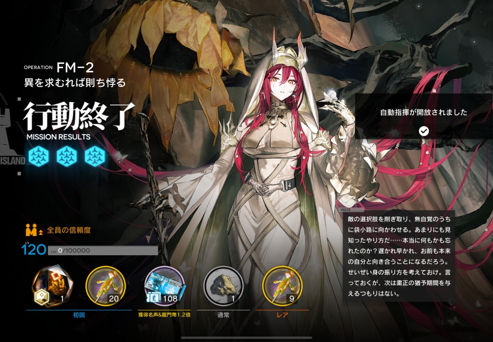 あとは、このまま敵を倒して作戦終了。無事、アークナイツ FM-2 攻略完了です。お疲れさまでした。