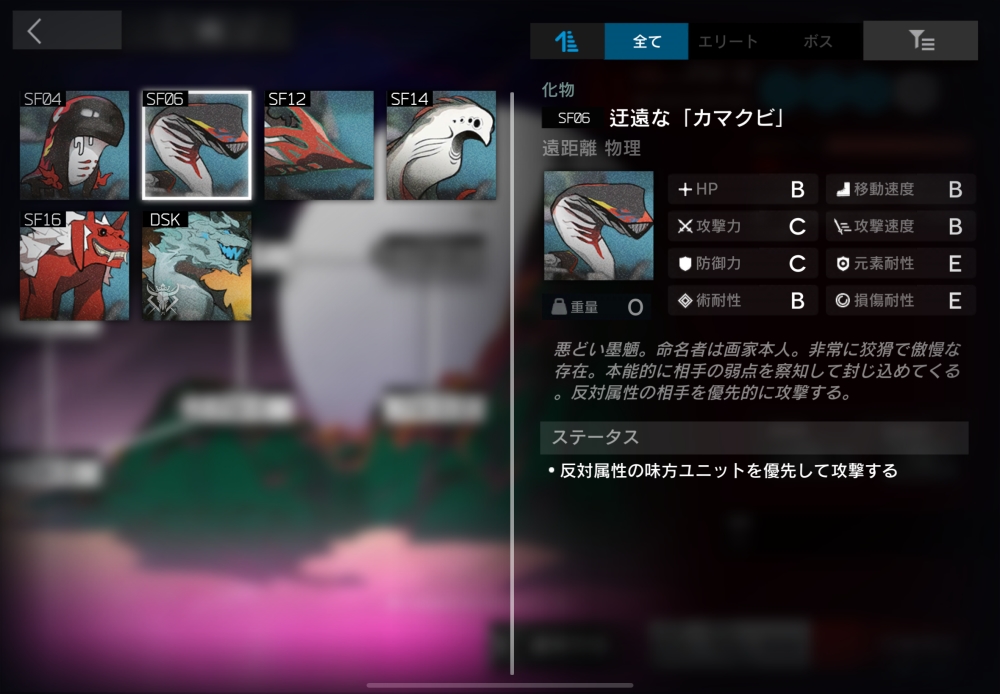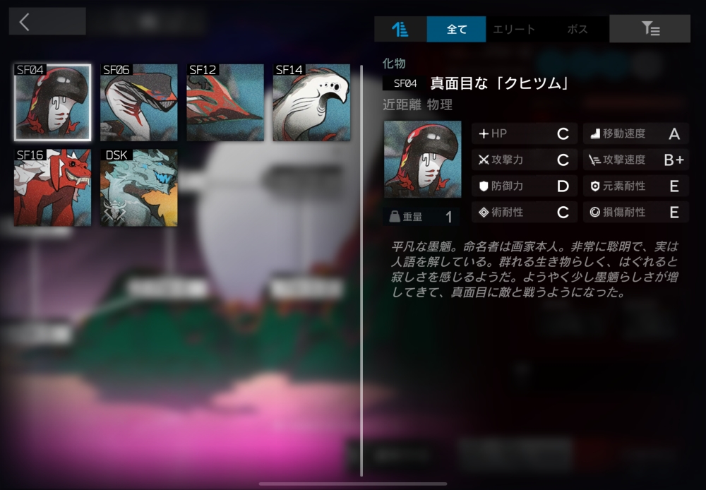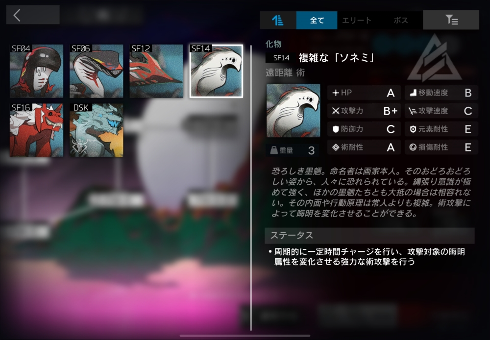 遠距離攻撃をしてくる、悪どい墨のもののけ。反対属性のオペレーターを優先的に狙う。7体ほど襲いかかってくる。