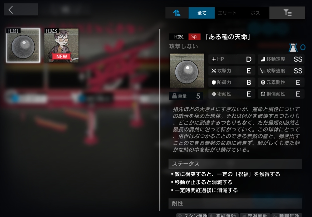 指先ほどの大きさにすぎないが、運命と慣性についての暗示を秘めた球体。敵に接触すると、その敵を強制移動させ「祝福」+10。幸運の玉座にいる味方に触れると消滅し、その味方のブロック数×10の「祝福」を得る。
