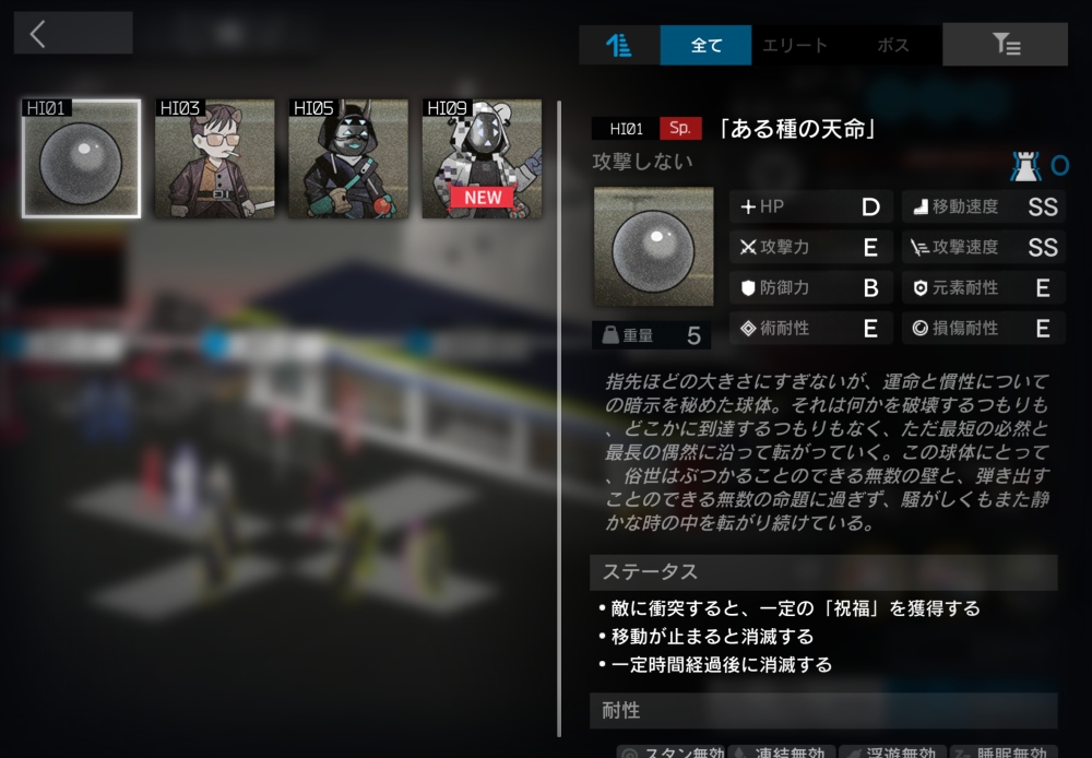 指先ほどの大きさにすぎないが、運命と慣性についての暗示を秘めた球体。敵に接触すると、その敵を強制移動させ「祝福」+10。幸運の玉座にいる味方に触れると消滅し、その味方のブロック数×10の「祝福」を得る。