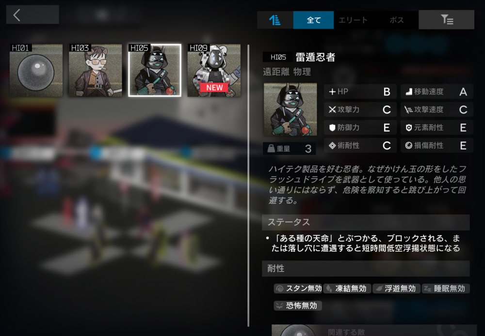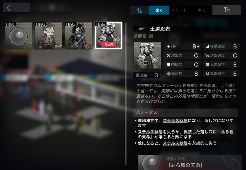 ハイテク製品を好む忍者。遠距離物理攻撃をしてくる。【びっくりした!】(自動回復/初期SP15/必要SP15)ブロックされるか、半径0.5以内に「ある種の天命」・偽装した土遁忍者系がいる、もしくは半径0.8以内に穴が存在するなら使用可能。即座にブロックを解除し、2秒間低空浮揚状態になり、0.33秒停止する。飛行中は攻撃せず、移動速度が300%に上昇。12体ほど襲いかかってくる。