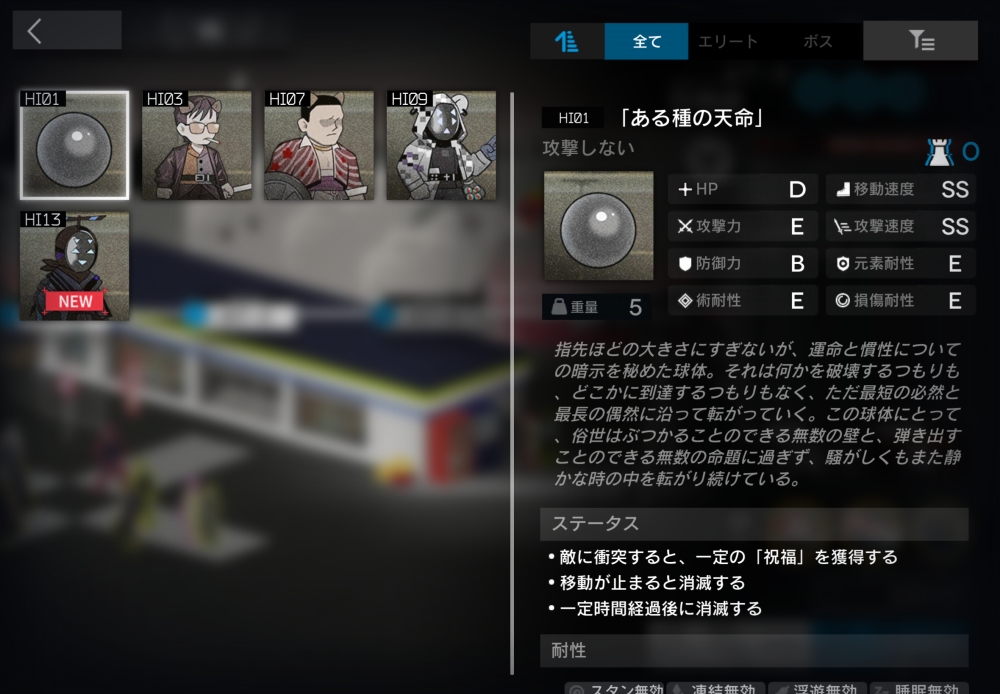 指先ほどの大きさにすぎないが、運命と慣性についての暗示を秘めた球体。敵に接触すると、その敵を強制移動させ「祝福」+10。幸運の玉座にいる味方に触れると消滅し、その味方のブロック数×10の「祝福」を得る。