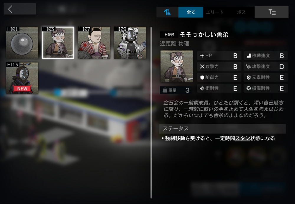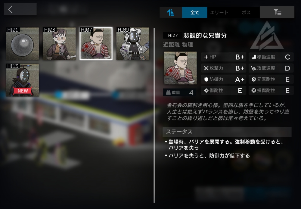 金石会の腕利き用心棒。耐久値8000の物理/術ダメージバリアを持つ。バリアを失うと、防御力-50%。強制移動後、バリアを失う。1体だけ襲いかかってくる。