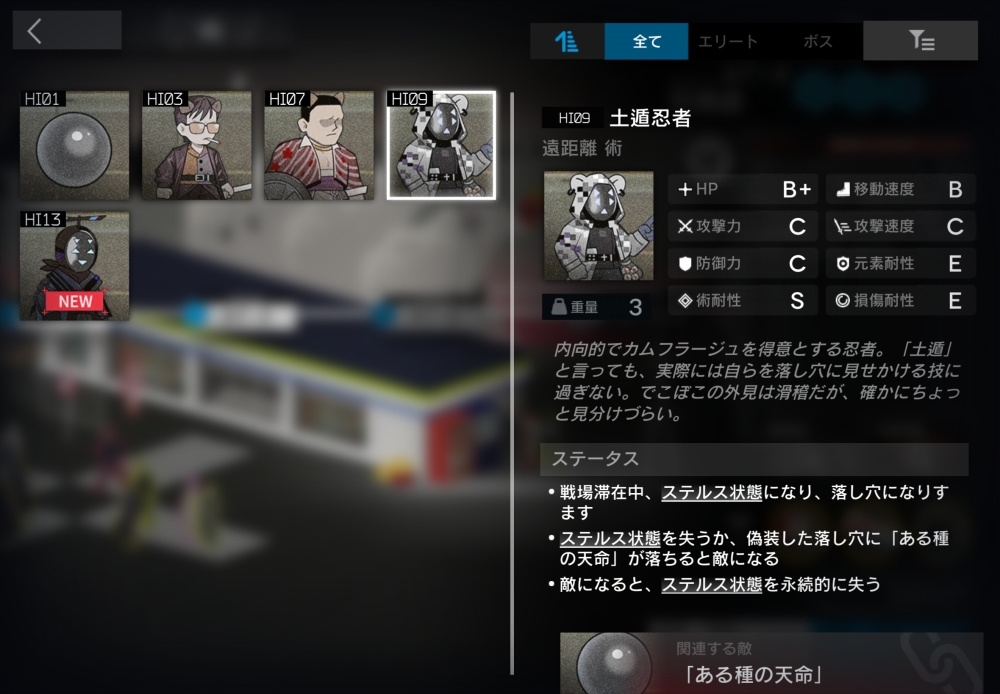 内向的でカムフラージュを得意とする忍者。遠距離術攻撃をしてくる。ステルスを無効化されると偽装を解除する。偽装中、半径0.35以内に「ある種の天命」が入るとそれを落下させ、偽装を解除する。1体だけ襲いかかってくる。