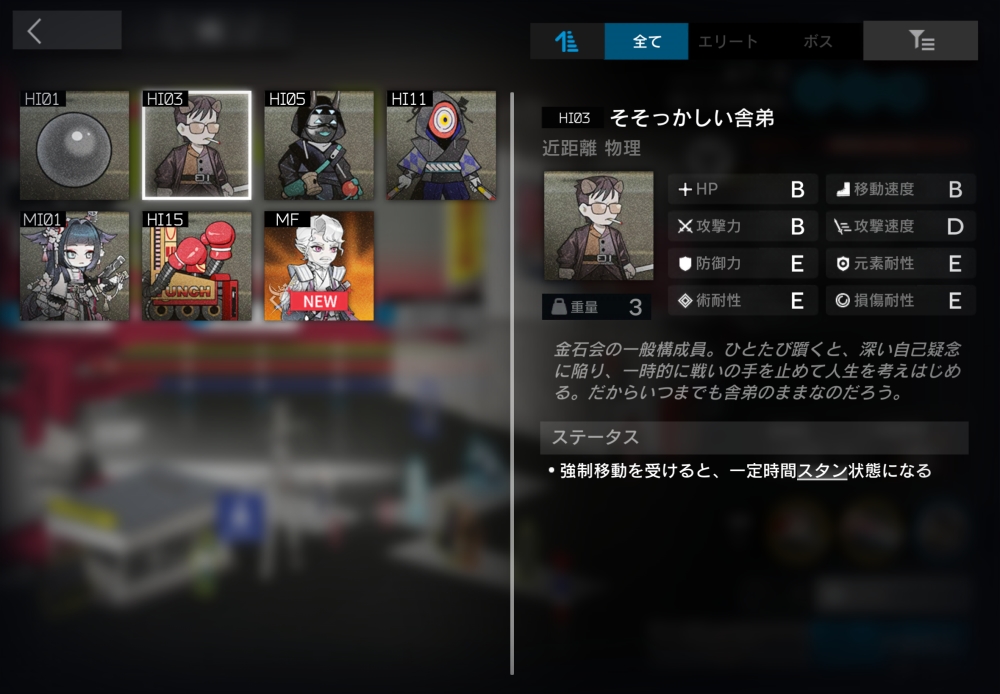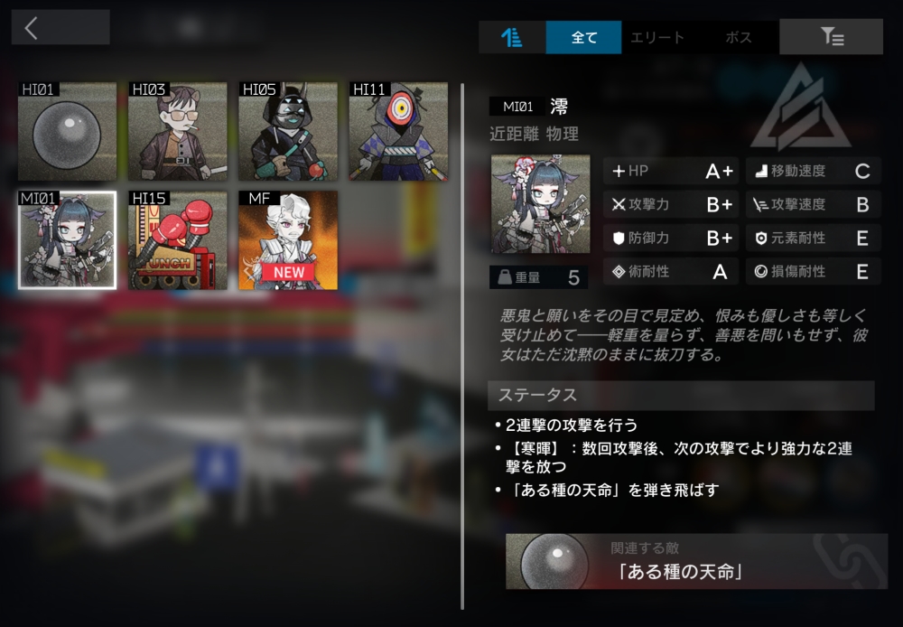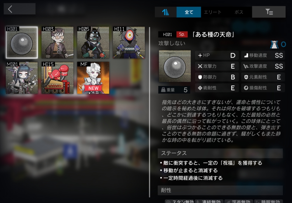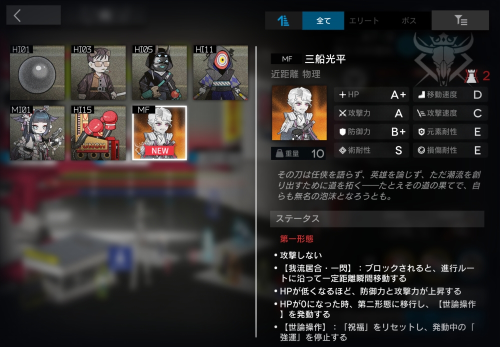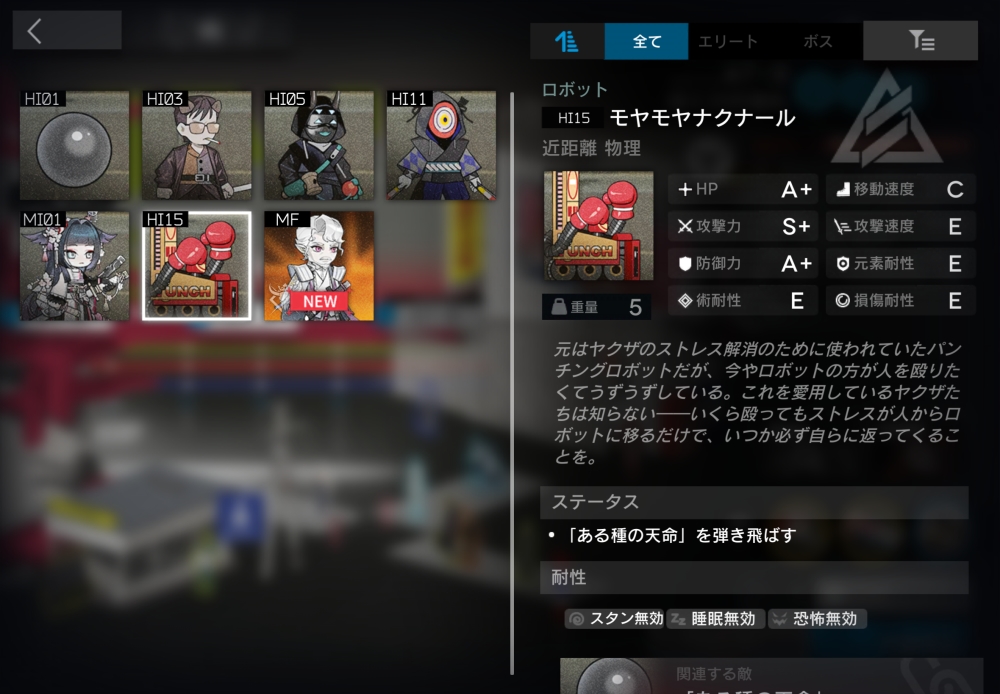 元はヤクザのストレス解消のために使われていたパンチングロボットだが、今やロボットの方が人を殴りたくてうずうずしている。「ある種の天命」を弾き返すことができる。装置の時は、天命が接触するたび最大HPの10%のダメージを受ける。一定時間経過すると、装置から敵に変化して動き出す。この時、残りHP割合を引き継ぐ。