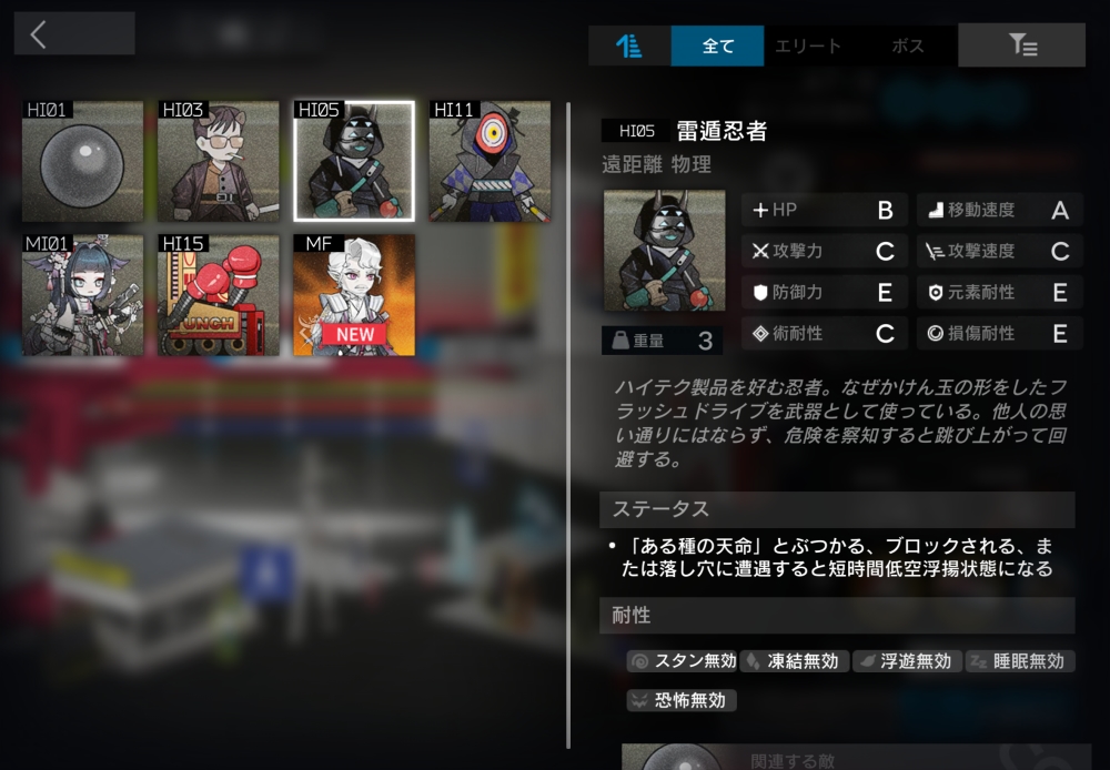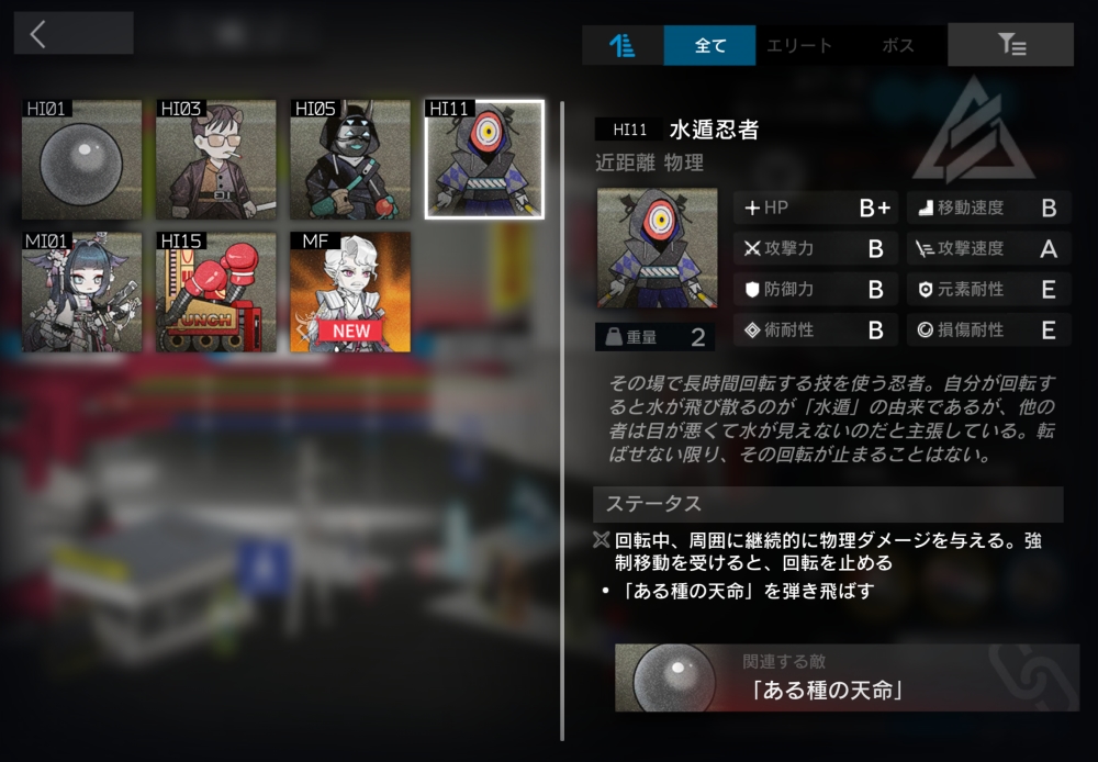 ハイテク製品を好む忍者。遠距離物理攻撃をしてくる。【びっくりした!】(自動回復/初期SP15/必要SP15)ブロックされるか、半径0.5以内に「ある種の天命」・偽装した土遁忍者系がいる、もしくは半径0.8以内に穴が存在するなら使用可能。即座にブロックを解除し、2秒間低空浮揚状態になり、0.33秒停止する。飛行中は攻撃せず、移動速度が300%に上昇。8体ほど襲いかかってくる。