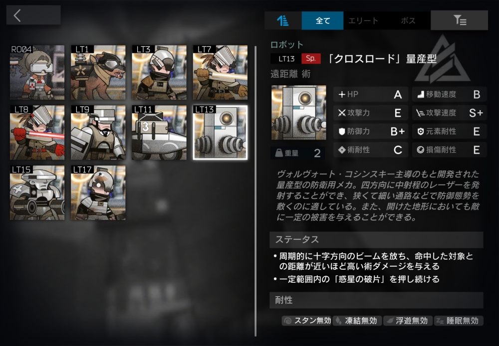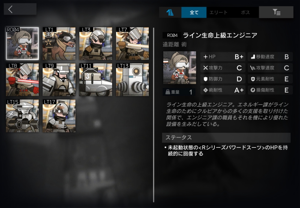 ライン生命の上級エンジニア。遠距離術攻撃をしてくる。また、起動していないRシリーズパワードスーツのHPを10秒間、対象の最大HPの5%分を回復し続ける。