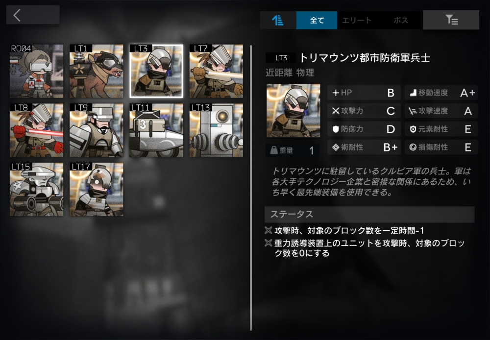 トリマウンツの駐留しているクルビア軍の兵士。攻撃時に対象のブロック数を一定時間-1にしてくる。2体ほど襲いかかってくる。