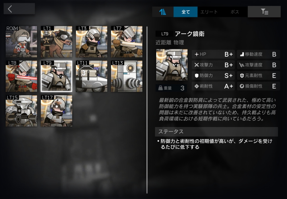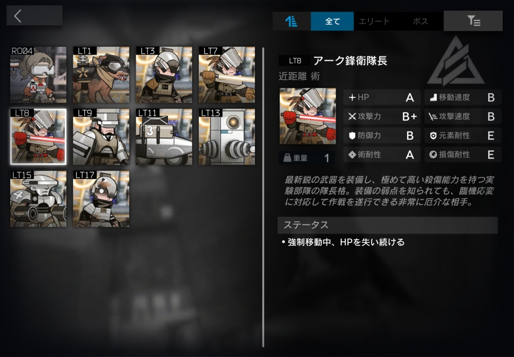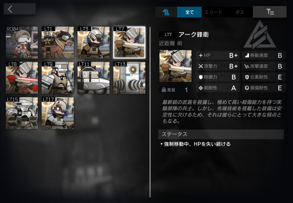 アーク鋒衛のベテランっぽい人。近距離術攻撃をしてくる。強制移動中、0.066秒ごとに400(1秒で約6000)の確定ダメージを受ける。