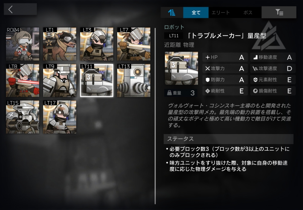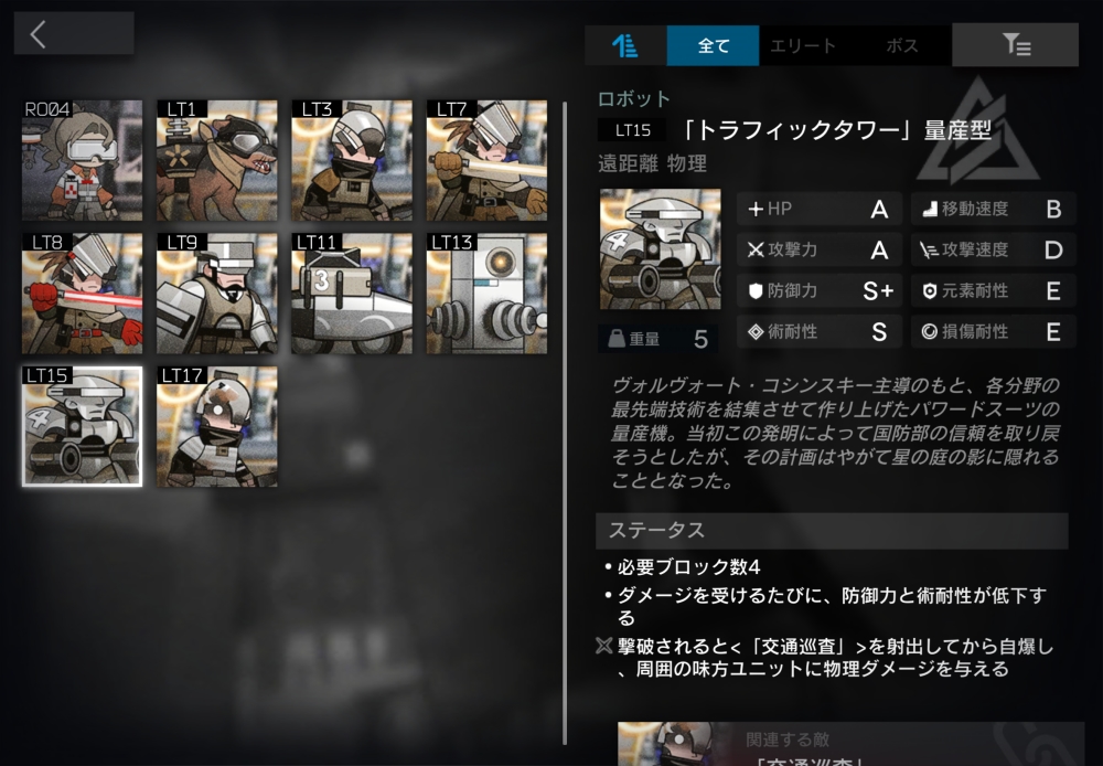 ヴォルヴォート・コシンスキー主導のもと、各分野の最先端技術を結集させて作り上げたパワードスーツの量産機。必要ブロック数4。ダメージを受けるたび、防御力-50・術耐性-1(110回まで累積する)。倒されると1秒後に自爆し、半径1.25以内の味方全員に攻撃力の200%の物理ダメージを与え、自身の位置に「交通巡査」を1体召喚する。