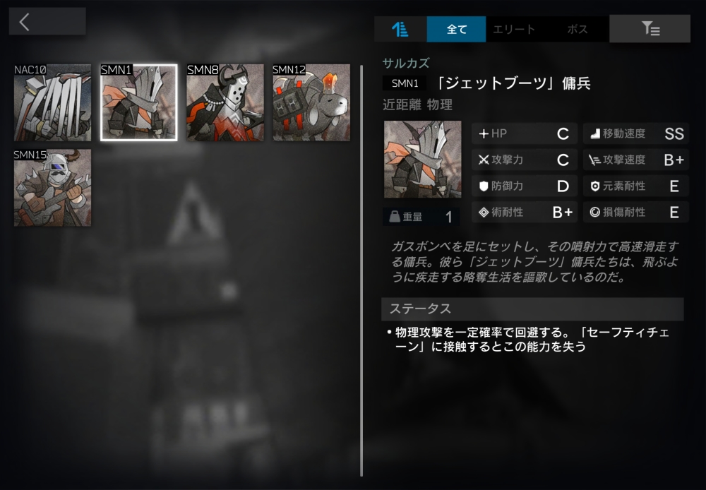 ガスボンベを足にセットし、その噴射力で高速滑走する傭兵。物理回避率+40%。ただし、セーフティチェーンに触れると、この効果は無効になる。6体ほど襲いかかってくる。