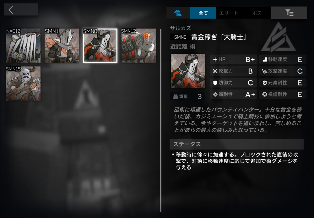 賞金稼ぎ「騎士」のベテランっぽい人。巫術に精通したバウンティハンター。0.5秒ごとに移動速度+50%(+0.125)。この効果は25回まで累積する。ただし、セーフティチェーンに触れるか、スタン/バインド状態の間は移動速度がリセットされ、速度上昇も停止する。また、ブロック後の初回攻撃時に、追加で「現在の移動速度×650」の術ダメージを与え、移動速度をリセットする。8体ほど突進してくる。