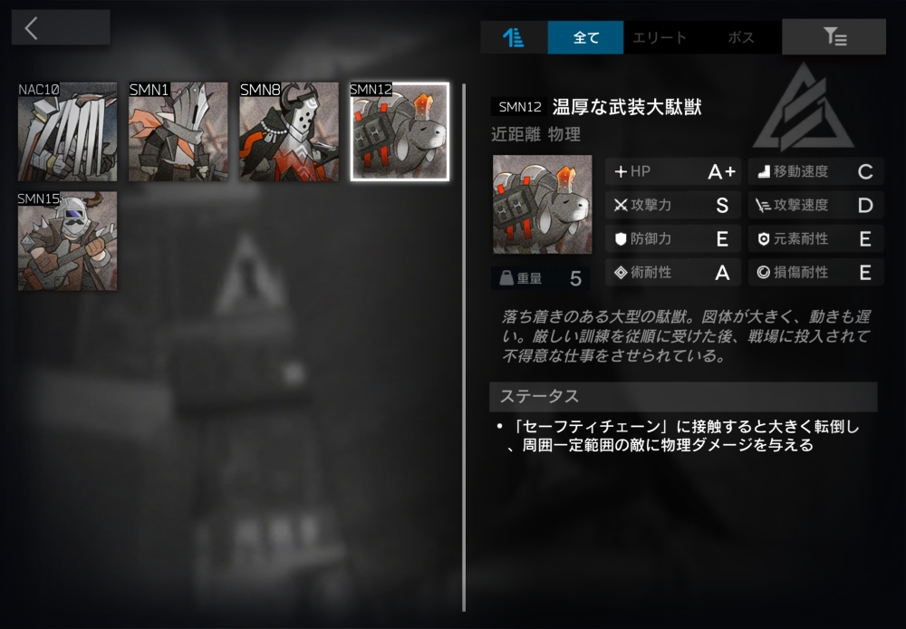 温厚な武装駄獣の大型版。落ち着きのある大型の駄獣。HPと攻撃力が高め。だけど、セーフティチェーンに触れると転倒し、10秒間バインド・ブロック不可・攻撃しない状態になる。また転倒時、半径2.0以内の敵全員に攻撃力200%の物理ダメージを与える。4頭ほど襲いかかってくる。