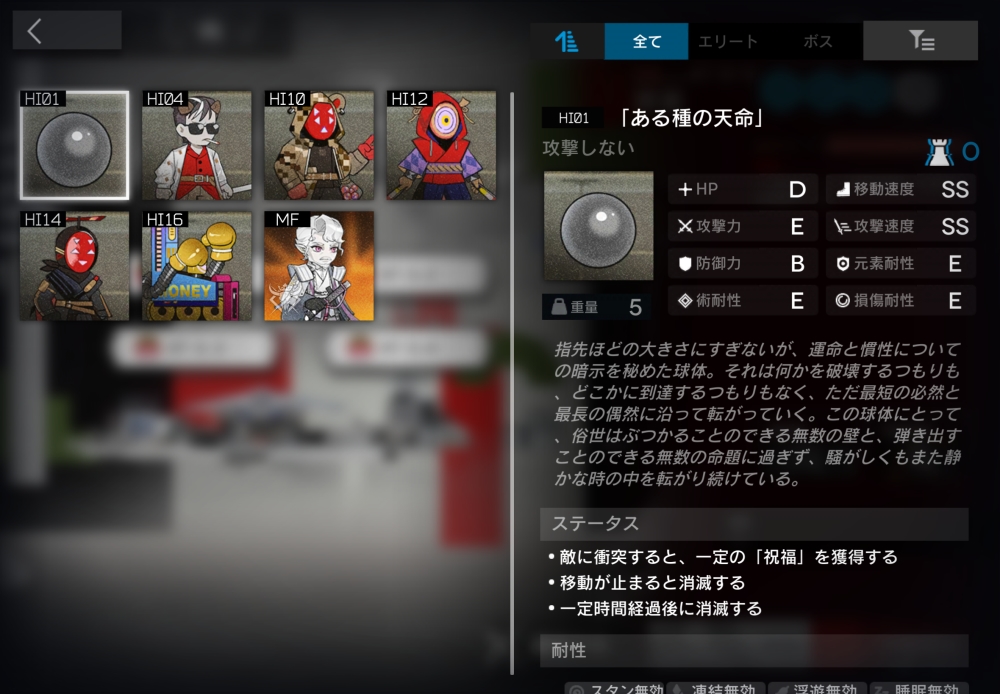 指先ほどの大きさにすぎないが、運命と慣性についての暗示を秘めた球体。敵に接触すると、その敵を強制移動させ「祝福」+10。幸運の玉座にいる味方に触れると消滅し、その味方のブロック数×10の「祝福」を得る。