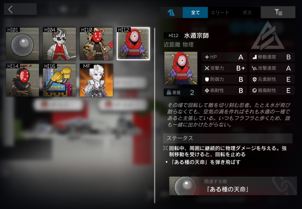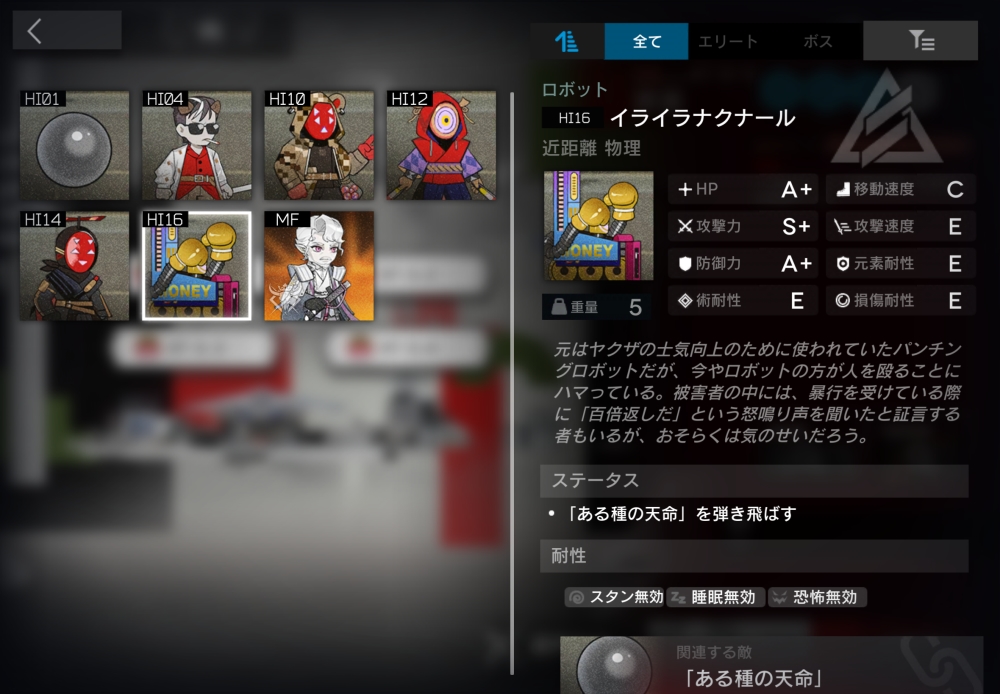 元はヤbbbクザの士気向上のために使われていたパンチングロボットだが、今やロボットの方が人を殴ることにハマっている。「ある種の天命」を弾き返すことができる。装置の時は、天命が接触するたび最大HPの10%のダメージを受ける。一定時間経過すると、装置から敵に変化して動き出す。この時、残りHP割合を引き継ぐ。2体ほど襲いかかってくる。