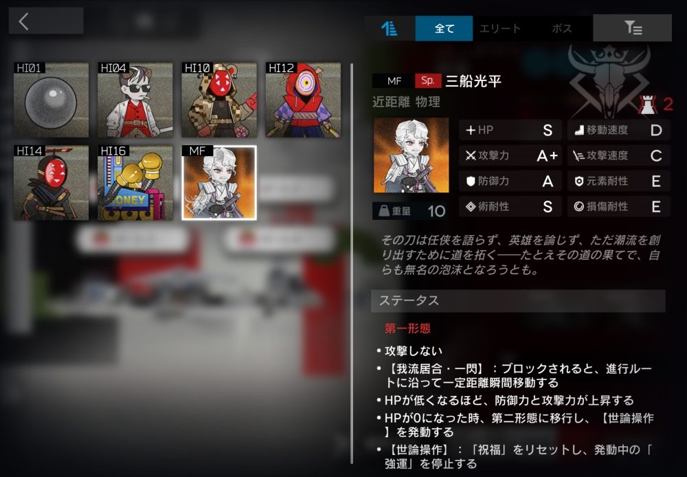 今回のボス役。HPが減るほど攻撃力・防御力が上昇し、すり抜けスキルでブロックを拒否してくる。ボスにしては弱い。